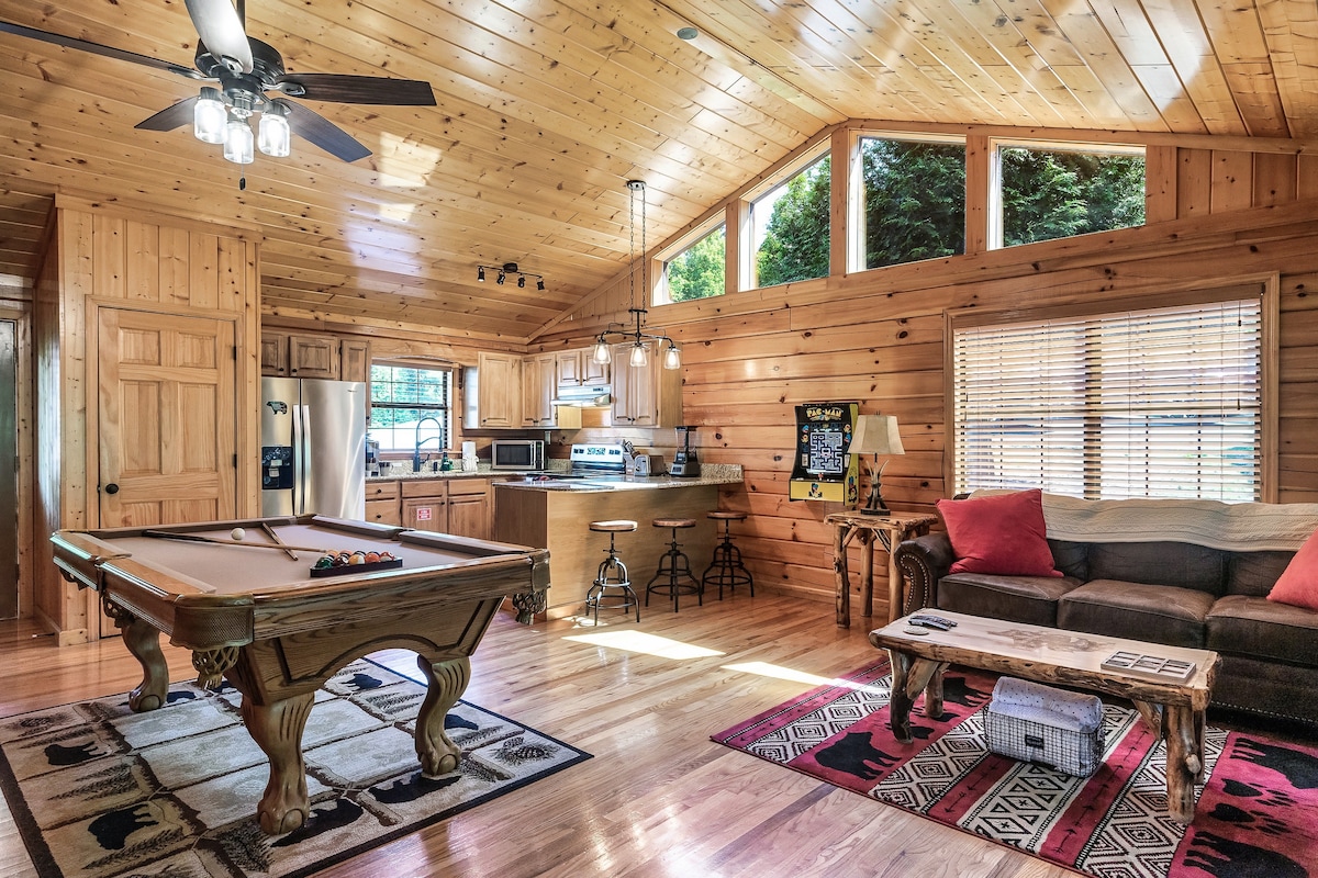 Nasza chatka położona jest w samym sercu Smoky Mountains, w otoczeniu bujnych zielonych lasów, wysokich drzew i panoramicznych widoków na góry. Wyposażona w jacuzzi, salę do gier i teatru, zawsze będziesz mieć coś do zrobienia! Gdy wejdziesz do środka, przywita Cię ciepła i przyjazna atmosfera. W części dziennej znajdują się miękkie sofy i kamienny kominek, przy którym można spędzić wieczór, czytając książkę lub rozmawiając z bliskimi.