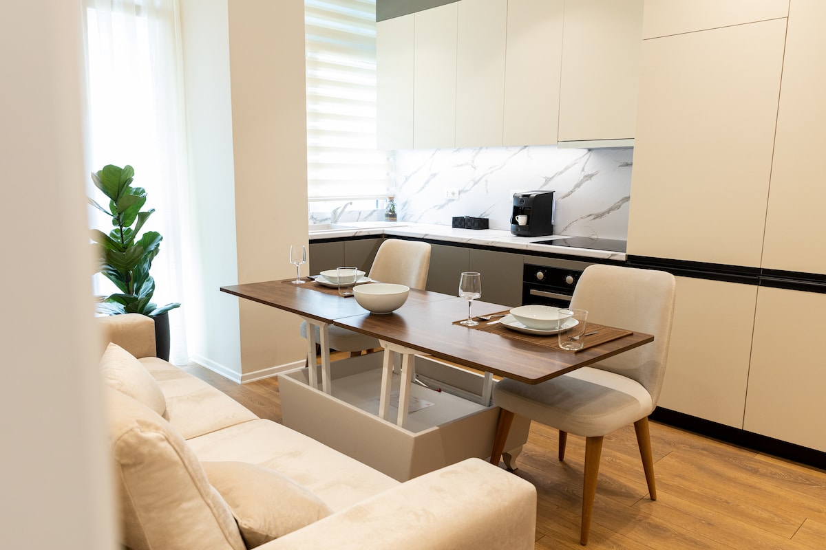 Experience the best of Tirana in our sunlit modern apartment, where privacy and cleanliness are our priorities. Enjoy the serene ambiance of a quiet, friendly neighbourhood nestled among villas. Ideal for extended stays, our first-floor location ensures easy access without the wait for an elevator. For added convenience, we offer self check-in. Immerse yourself in the comfort and charm of our perfectly situated home, making your stay in Albania's vibrant capital truly unforgettable.