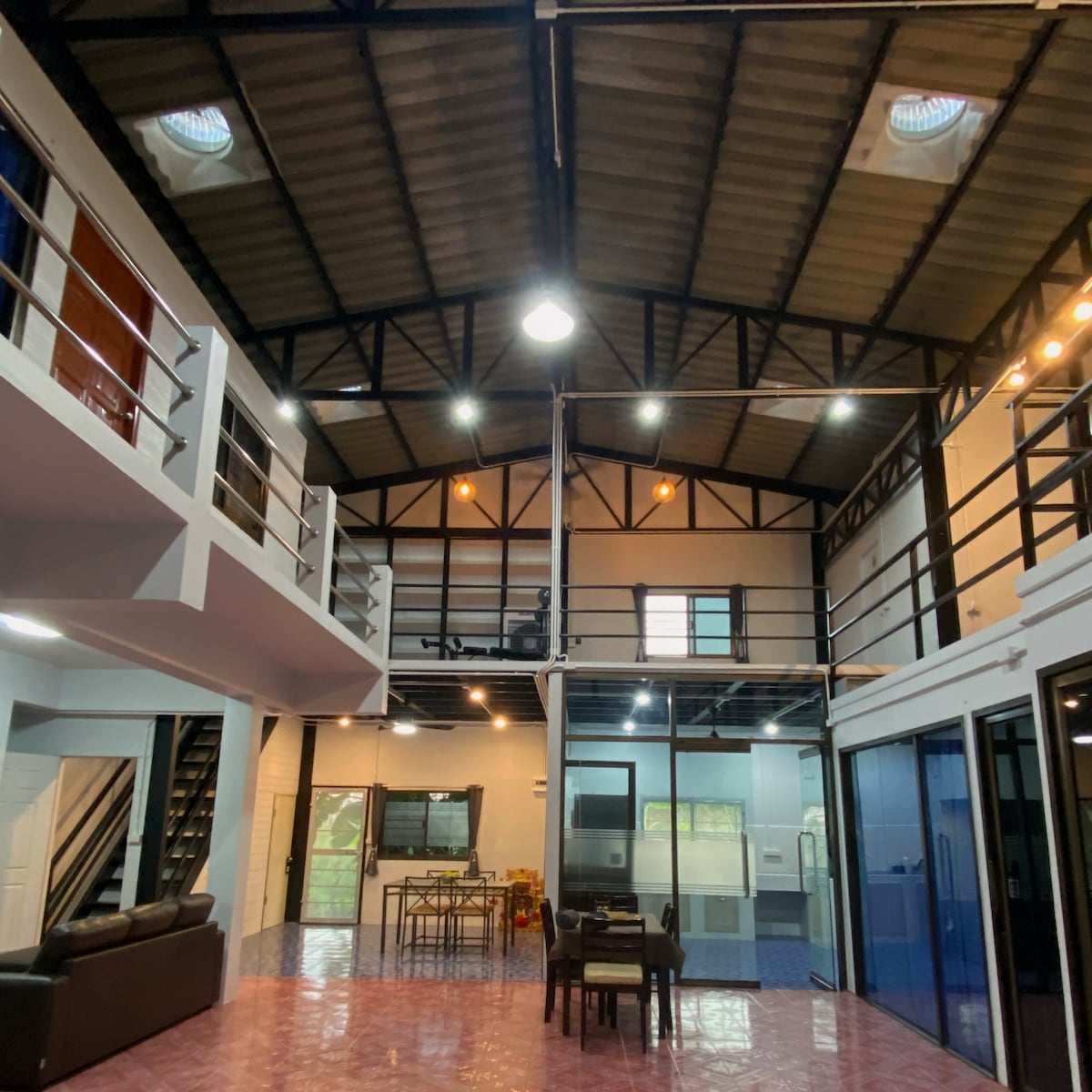 Relax between flights in this unique yet peaceful house by a canal, only 10 minutes from Don Meang International AirPort, 10 minutes from Lak Hok red-line MRT station 4 Bedrooms ( 2 queen bed and 2 doubles rooms) 2 Bathrooms Fully equipped kitchen High-speed Wifi Smart TV Spacious living spaces Situate in a quiet neighborhood with private access to a canal and herbs garden you can use. A corner store 200 m away. A Steak restaurant 140 m away. A Thai restaurant 80 m away.