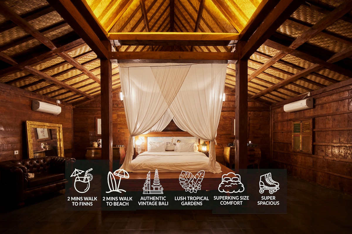 Huge Authentic Balinese wooden house on top of a brick castle. A rare find in Bali, offering spaciousness, charm, & privacy. Lush gardens minutes from Berawa Surf Beach, Finns & Atlas Clubs & Restaurants. King size bedroom/lounge with ensuite, balcony, and TV, perfect for work or leisure. Downstairs, a shared kitchen, dining, and lounge area. Sprawling gardens over 500 sqm and a 10-meter pool. Other Spaces airbnb.ca/h/Joglo1 airbnb.ca/h/joglo2 airbnb.ca/h/duajoglos airbnb.ca/h/wholevilla