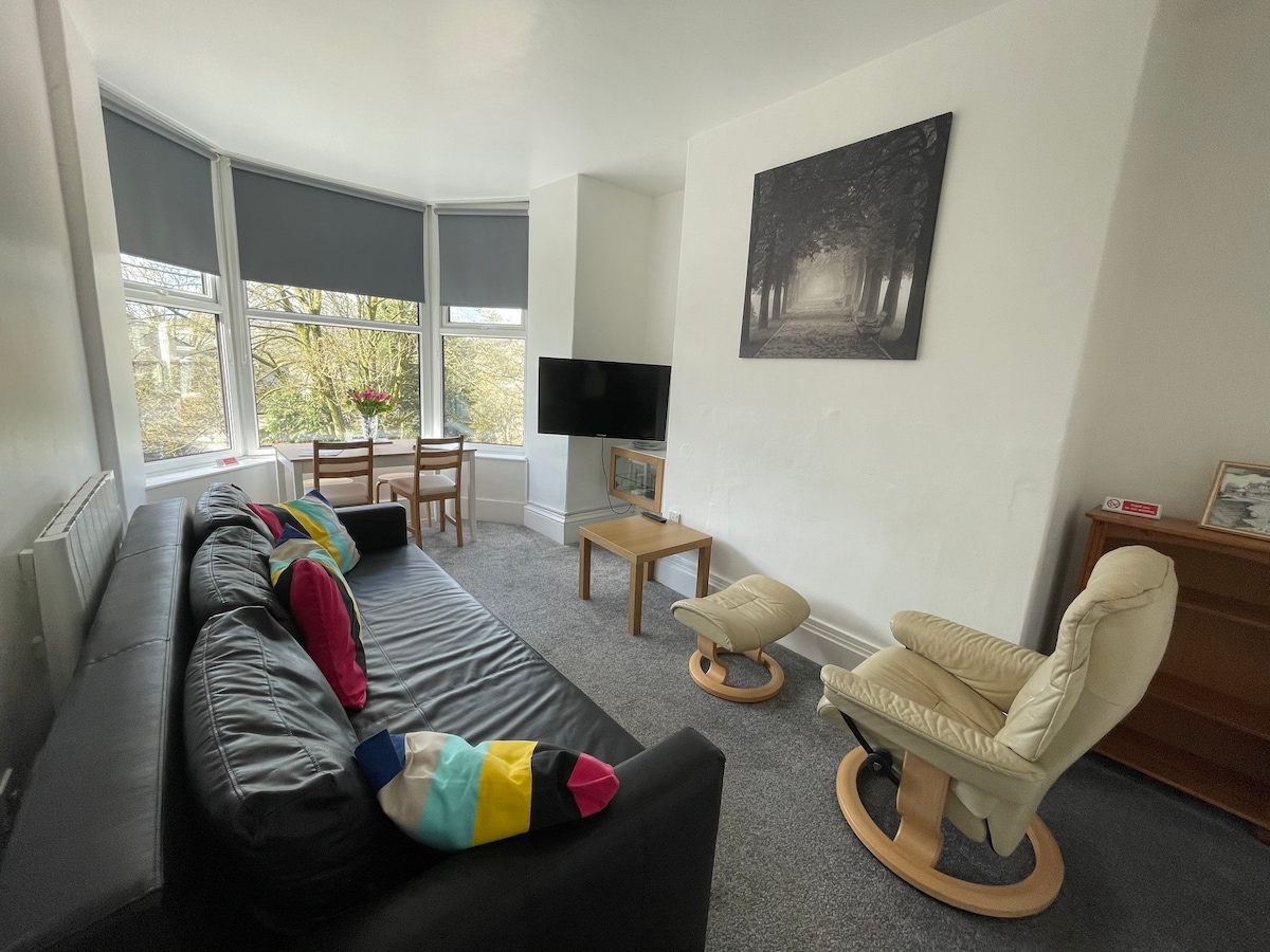I double bedroom self contained flat. Separate shower room, well equipped kitchen and a spacious and light living room. Free wifi, 42" flat screen TV, complementary tea, coffee, biscuits. Suitable for 2 adults. The property is located in a quiet residential area with a green space behind. About 10 mins walk from the town centre. There is a small amount of off road parking in front of the property and plenty of easily accessible on road parking to the rear.