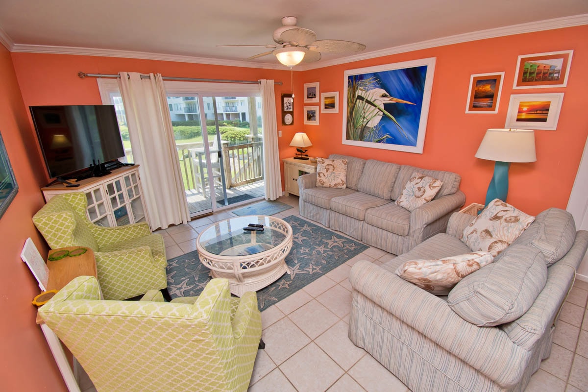 Trzy sypialnie na pierwszym piętrze apartamentowca, które mogą pomieścić sześć osób, położone w pierwszym rzędzie z krytym i dwoma odkrytymi basenami, siłownią i trzy minuty spaceru do plaży. Sklepy spożywcze i wiele restauracji znajdują się w odległości 1 mili od rezydencji. Spokojna, ogrodzona społeczność. Telewizor w każdej sypialni i pokoju głównym. 43" - 65" Ładny szeroki chodnik do biegania i jazdy na rowerze biegnie wzdłuż Emerald Dr przez całe miasto Emerald Isle.