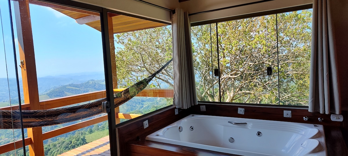 Odkryj urok Serra da Mantiqueira w tej chacie zaprojektowanej tak, aby można było kontemplować wschód słońca bez wstawania z łóżka. Zrelaksuj się w naszym ogrzewanym spa, obserwując gwiazdy nad głową i huśtając się. W kabinie znajduje się zintegrowany pokój z przytulnym łóżkiem typu Queen. W salonie/kuchni bardzo wygodny futon pomieści jeszcze dwóch gości, dzięki czemu atrakcja jest idealna dla rodzin. Na terenie posesji znajdują się również szlaki i małe wodospady.