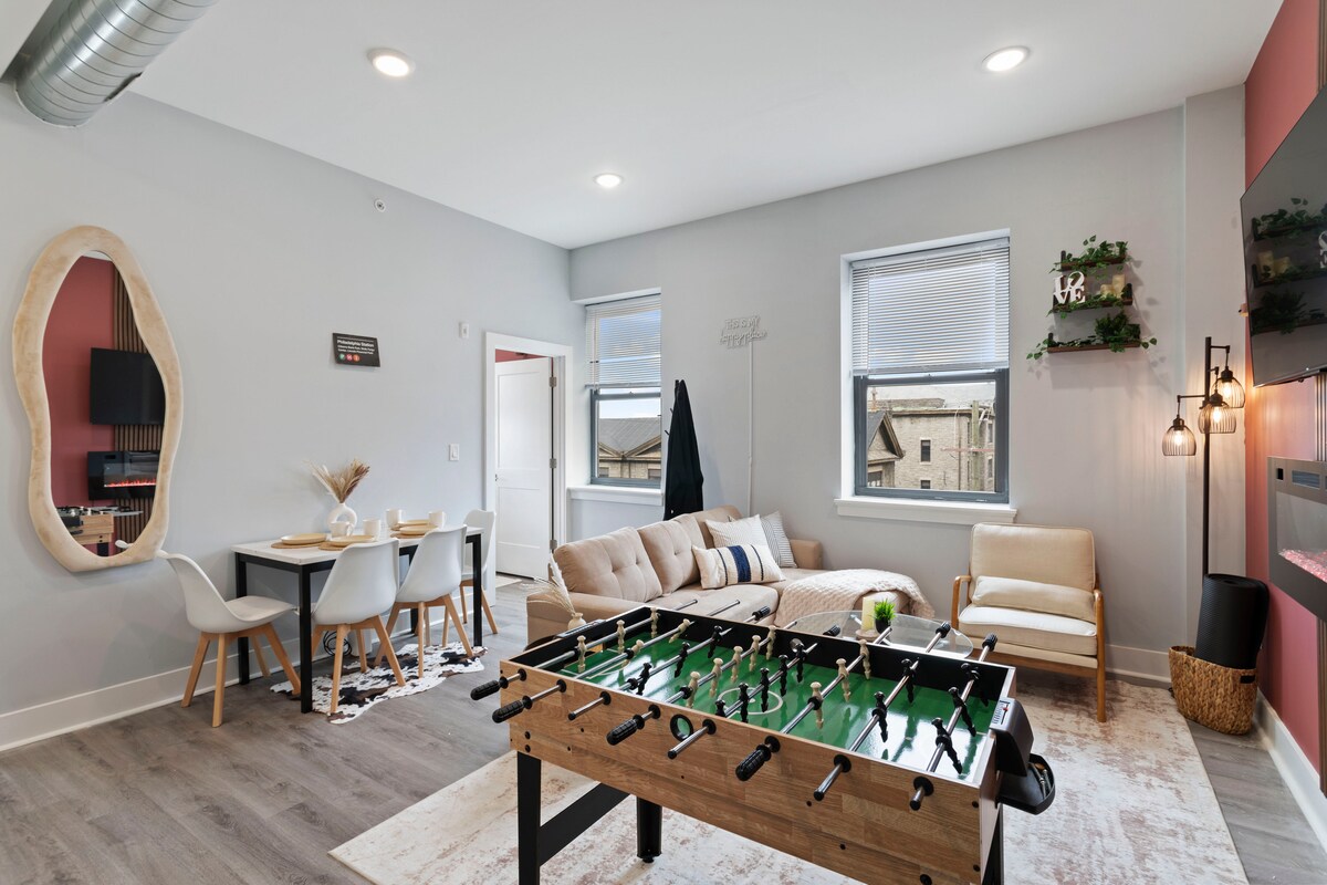 Nowoczesny apartament Lux z 2 sypialniami w południowej Filadelfii! Miejski elegancki apartament z wystrojem w kolorach ziemi, w pełni wyposażoną kuchnią, pralką i suszarką, przestronnym salonem z rozkładaną kanapą, składanym biurkiem i dwiema sypialniami z łóżkiem typu queen. Korzystaj z siłowni i dostępu do dach z pięknym widokiem na miasto. Ciesz się wygodnymi zakupami kilka kroków od Target i centrum handlowego z artykułami spożywczymi. Kultowe restauracje, bary, parki i rozrywki znajdują się w odległości krótkiego spaceru – idealne na dzień zwiedzania. Twoja wyprawa do miasta czeka!