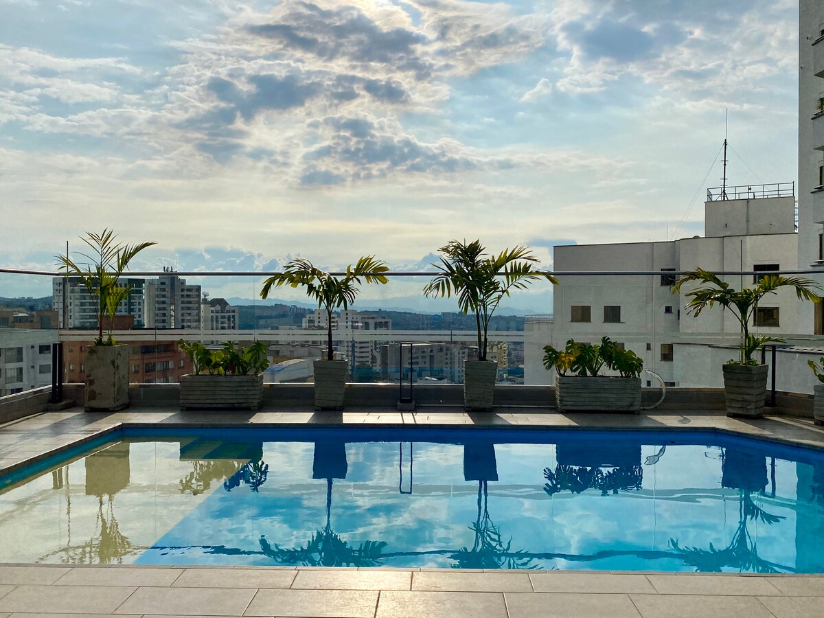 Rozkoszuj się jasnym i przytulnym apartamentem z panoramicznym widokiem, który zachęca do relaksu. Idealne miejsce, aby się odprężyć, budzić się każdego ranka przy pięknym krajobrazie i spędzić wyjątkowy pobyt. Wyposażony w nowoczesne udogodnienia i zaprojektowany tak, abyś poczuł(a) się jak w domu od pierwszej chwili po przyjeździe. Ponadto w budynku znajduje się basen na dachu i zadaszone miejsce parkingowe. Zarezerwuj teraz i ciesz się Pereirą w dobrym stylu, komforcie i z doskonałej lokalizacji.