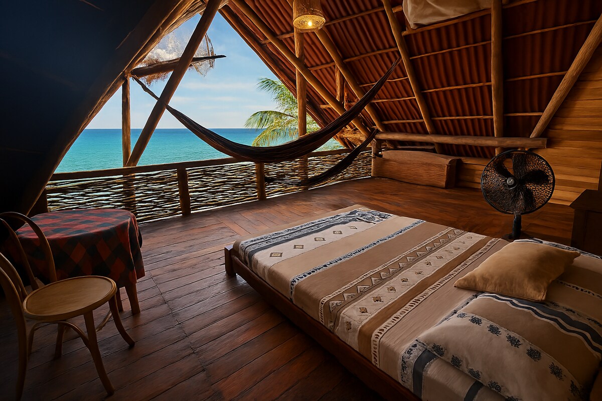 Chata z widokiem na morze w Dibulla, la Guajira, położona 1:30 godz. od Santa Marta lub 50 min od Rioacha, w Dibulla. które zawierają: Pokój dla maksymalnie 5 osób z własną łazienką, mamy również bezpośredni dostęp do plaży, dostęp do wspólnych części wspólnych, takich jak taras i kuchnia, Idealne miejsce, aby oderwać się od konwencjonalnej turystyki, prywatne i spokojne, mamy lekcje surfingu i spacery w górach.