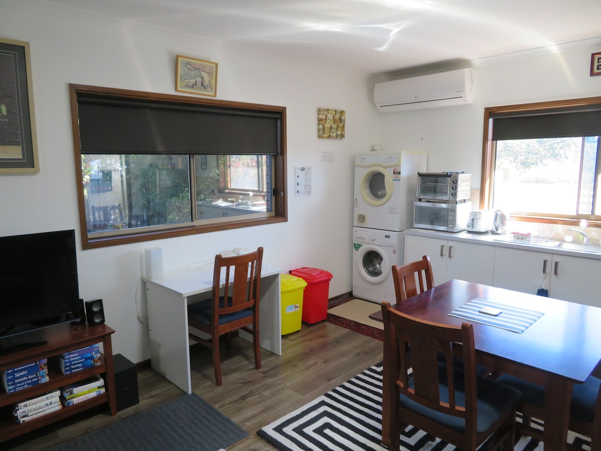 Apartament typu studio znajduje się z tyłu wolnostojącego ceglanego garażu dwustanowiskowego z własnym prywatnym wejściem i parkingiem poza ulicą. Posiada małe podwórko, własną łazienkę, pralkę i suszarkę. Dobrze wyposażony aneks kuchenny. Odpowiednie dla 1 pary (łóżko typu Queen). Rozkładane łóżko (na życzenie) jest dostępne dla 2 osób, które podróżują razem, ale nie jako para. Nieodpowiednie dla dzieci. Tylko pobyty krótkoterminowe. Surowo ZABRONIONE jest palenie w mieszkaniu. Nieruchomość NIE jest odpowiednia dla zwierząt domowych.