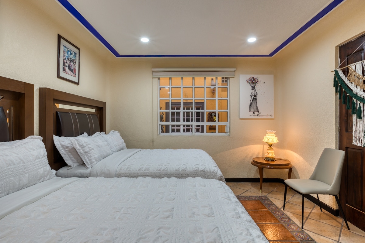 Lindo departamento en el corazón de Coyoacán, muy iluminado, completamente equipado, cuenta con 1 recámara con 2 camas matrimoniales, 1 sofá-cama matrimonial. Este departamento es perfecto para 3 adultos y 1 menor, o 2 adultos y 2 menores. Está a 3 calles del museo Frida Kahlo, a media calle del museo León Trotski y a 6 cuadras del Zócalo de Coyoacán.