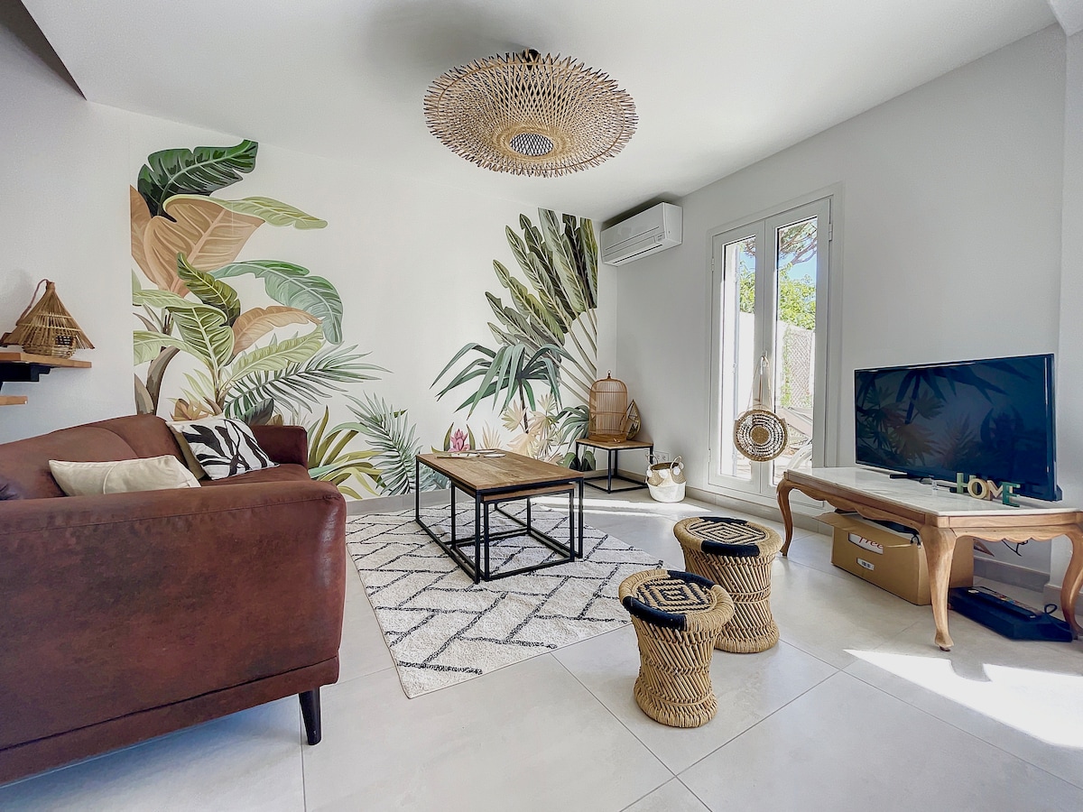 Détente et ressourcement dans un cadre exceptionnel naturel et calme, cette maison aux portes de Montpellier de 130 m2 avec son jardin de 600m2 est spacieuse et chaleureuse , c’est l’endroit pour les amoureux de la nature.Située à qq minutes à pieds de nombreux sentiers de randonnées , elle est également proche des plage (20mn), rivière (30mn) lac du salagou (30mn) et à 5 mn du centre de juvignac ( tous commerces et tram ( gare et aéroport)) Idéal pour se retrouver en famille ou entre amis