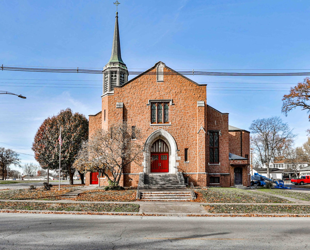 Ta odnowiona kaplica jest blisko wszystkiego. Położony tuż przy parku, w odległości spaceru od głównej ulicy. Każde mieszkanie jest samodzielne z wejściem bez klucza. Idealne na przyjemny wypoczynek lub dłuższe pobyty w ramach umów o pracę. Pełna kuchnia. Kilka pociągów przejeżdża obok, ale dzięki naszej maszynie dźwiękowej to mieszkanie w centrum miasta staje się Twoim sanktuarium snu. Przyjedź i ciesz się prywatnym apartamentem w tym odrestaurowanym kościele z lat 20. XX wieku. 25 minut do Carbondale, 1 godzina 20 minut do Belleville, 45 minut do Marion