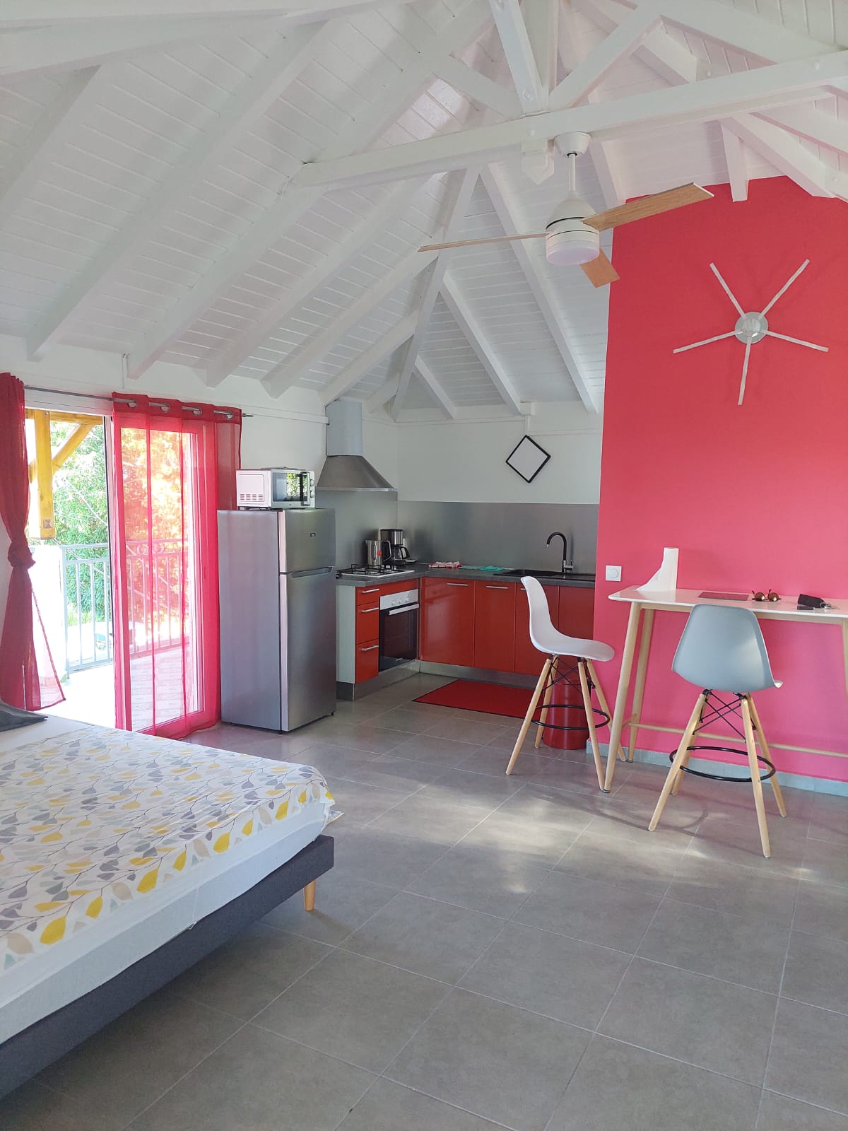 Apartament w dolnej części willi z niezależnym wejściem, położony w domu bioklimatycznym na skraju lasu tropikalnego. Idealne dla miłośników przyrody. Do dyspozycji gości jest przestronny pokój, łazienka i duży taras z małą kuchnią. Odkryj piesze wycieczki (kanion Moustique) bezpośrednio z domu lub odpocznij kołysząc się w rytmie szumu lasu i rzeki. W pobliżu znajdują się również obiekty użyteczności publicznej (5 km do sklepów, 20 km do lotniska)