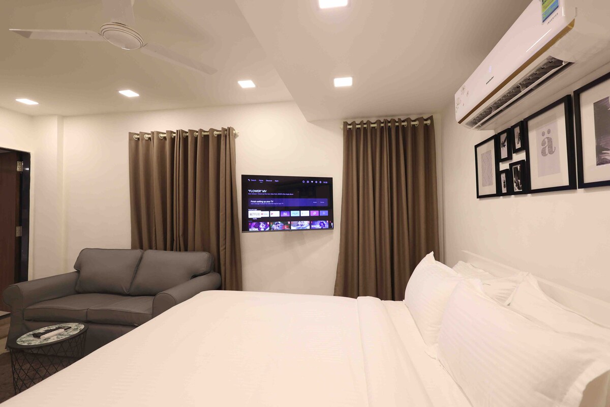 Witamy w The Hillview Atelier, butikowym apartamencie z 1 sypialnią w samym sercu Hiranandani, Powai. Obudź się przy delikatnym słońcu, spokojnym widoku na wzgórza i spokojnej atmosferze idealnej dla osób podróżujących służbowo, par i dłuższych pobytów. Ciesz się nowoczesnymi udogodnieniami, takimi jak szybkie Wi-Fi, telewizor Smart TV, klimatyzacja, wygodne stanowisko pracy, w pełni wyposażona kuchnia i spokojna sypialnia w bezpiecznym osiedlu. Kilka minut od kawiarni, barów, promenad i podstawowych udogodnień Nie hotel, ale wyselekcjonowany dom z urokiem Powai.