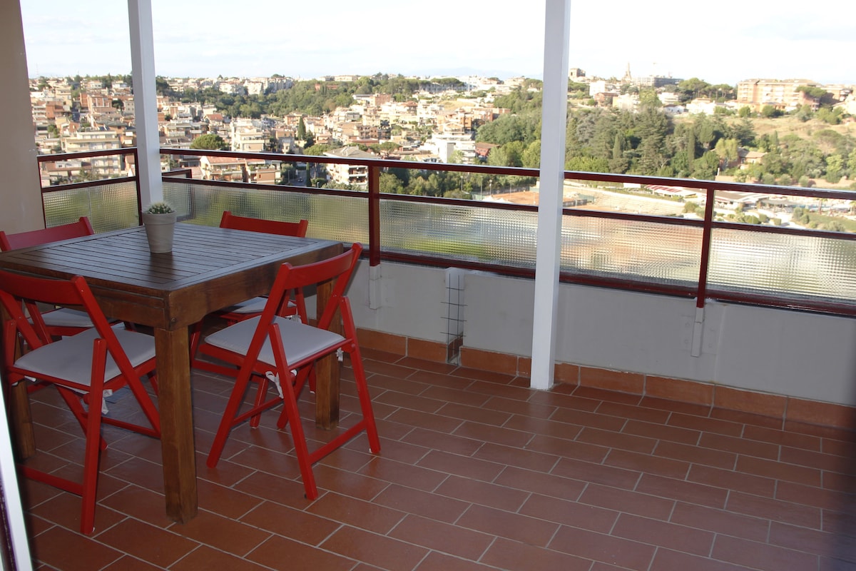 W centrum Rzymu prywatny apartament na ostatnim piętrze z żaluzjami w oknach salonu, które wpuszczają światło i umożliwiają podziwianie widoków na centrum Rzymu i Bazylikę św. Piotra. Zabytkowy kominek, płytki z terakoty tworzą tradycyjny klimat. Prywatny taras w pełni umeblowany. Dwie sypialnie z podwójnym łóżkiem. Dziesięć minut spacerem od placu św. Piotra i Muzeów Watykańskich. Widok na Rzym i Bazylikę św. Piotra. 2 minuty spacerem do komunikacji miejskiej, autobus i metro zabiorą Cię łatwo do wszystkich głównych zabytków.