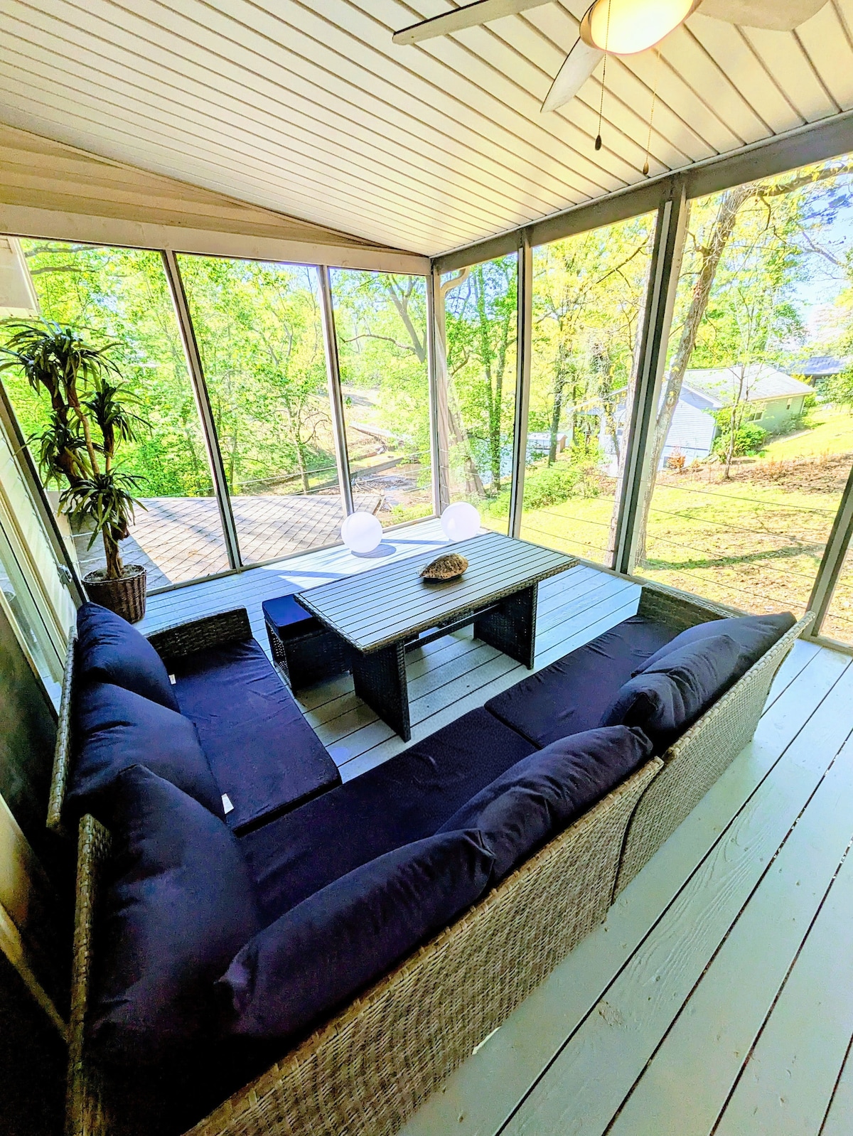 Completely renovated A-Frame on secluded lot overlooking Shoals Creek. Enjoy morning coffee on the screened porch and evenings by the firepit. Head down to the pier for fishing, swimming or tie your boat to the pier whips. Great for 2 families with 3 full baths, 2 kitchens, game room and loft for the the kids. We have an additional lake house next door for multiple groups. Please view videos of this listing and our neighboring Sylvan Cabin on our public FB page, Five Star Review Properties.