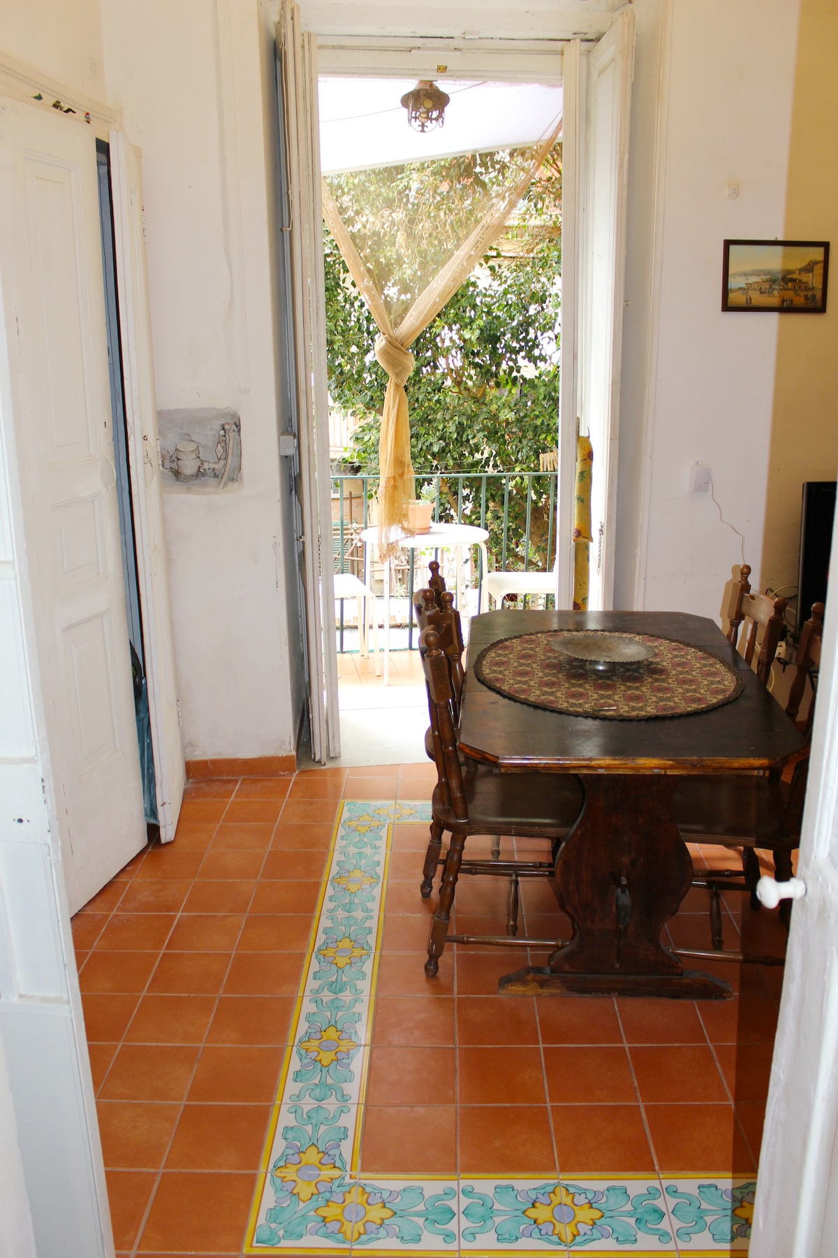 Przenieś się w czas o ponad 100 lat. Zanurz się w środowisku bogatym w sztukę i podziwiaj wspaniałe freski w stylu secesyjnym, które zdobią sufit salonu i sypialni. Duży balkon otacza całe mieszkanie, dzięki czemu można delektować się aperitifem siedząc przy stole. W dużym salonie obszerny regał oddziela jadalnię od drugiej sypialni. Oprócz fresków na sufitach, znajdziesz tu oryginalne podłogi i meble z epoki, które zapewnią Ci niezapomniane wrażenia.