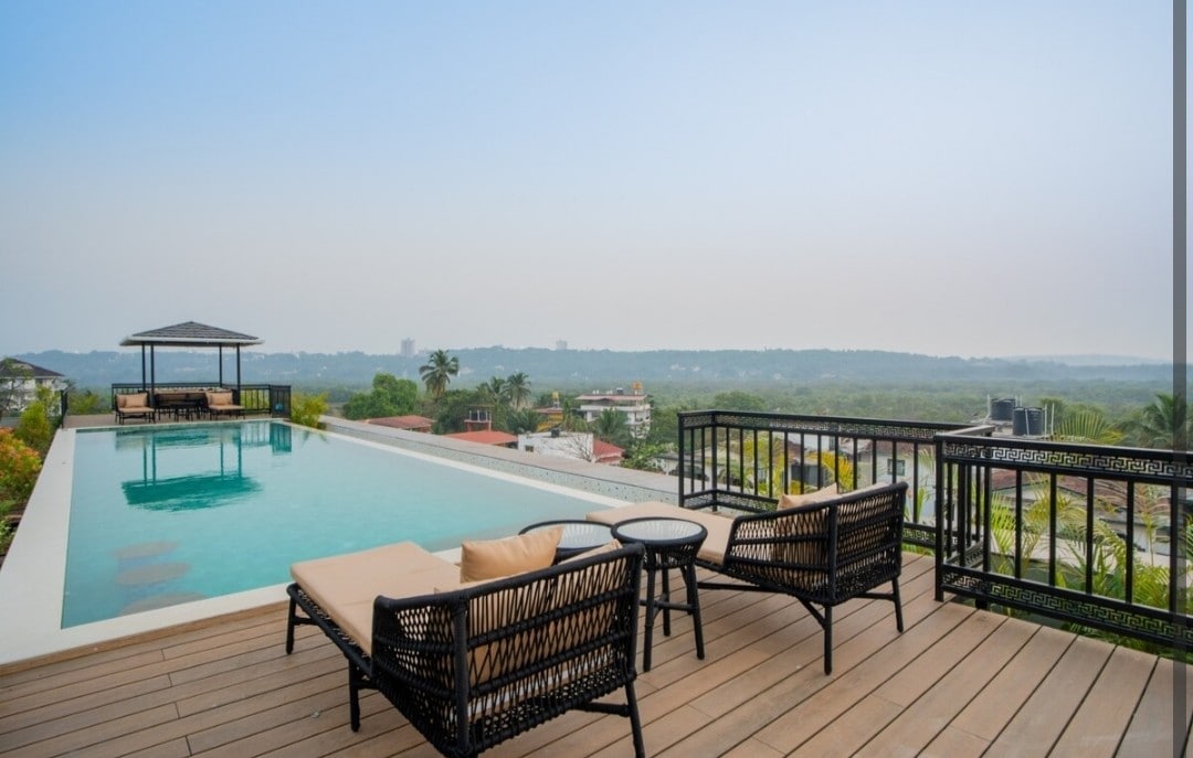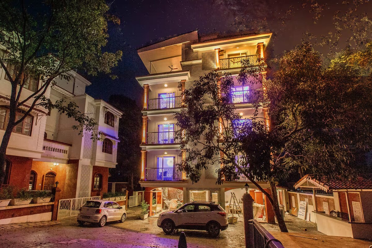 ◆Zaledwie 4,4 km od Candolim Beach. Basen ◆na dachu, przytulna altana i wspaniałe widoki – idealne na relaksujące wieczory. ◆Sypialnia z eleganckimi wnętrzami i łazienką z jacuzzi. ◆Apartament 1-BHK z balkonem, idealny na niezapomniany wypad do Goa. ◆Salon z wygodnymi sofami, telewizorem, prywatnym balkonem i jadalnią. ◆Ciesz się najwyższej klasy obsługą 5-gwiazdkowego zespołu ds. gościnności w duchu „Atithi Devo Bhava”