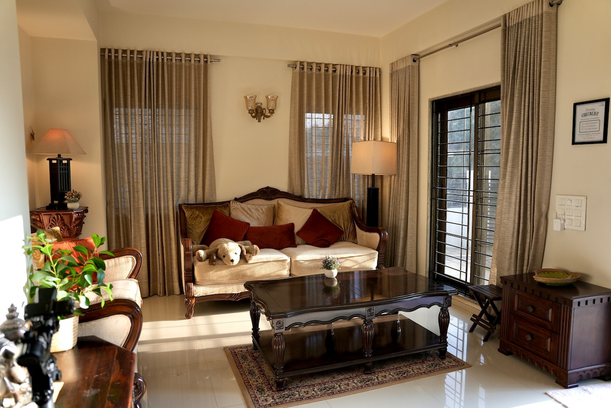 Zapomnij o swoich zmartwieniach w tym przestronnym i spokojnym domu! Witamy w pięknej, przytulnej przestrzeni wypełnionej naturalnym światłem – jest spokojna, słoneczna i idealna na relaks. Pokochasz spędzanie czasu w ogrodzie, niezależnie od tego, czy pijesz poranną kawę, czy po prostu cieszysz się spokojnym świeżym powietrzem. Ponieważ jest to obszar mieszkalny, upewnij się, że nie przeszkadzasz sąsiadom. *** Mamy jeszcze 2 oferty dla tego samego bunglow - Vatsalya I dla 6 gości i Vatsalya Studio Apartment dla 3 gości. ***