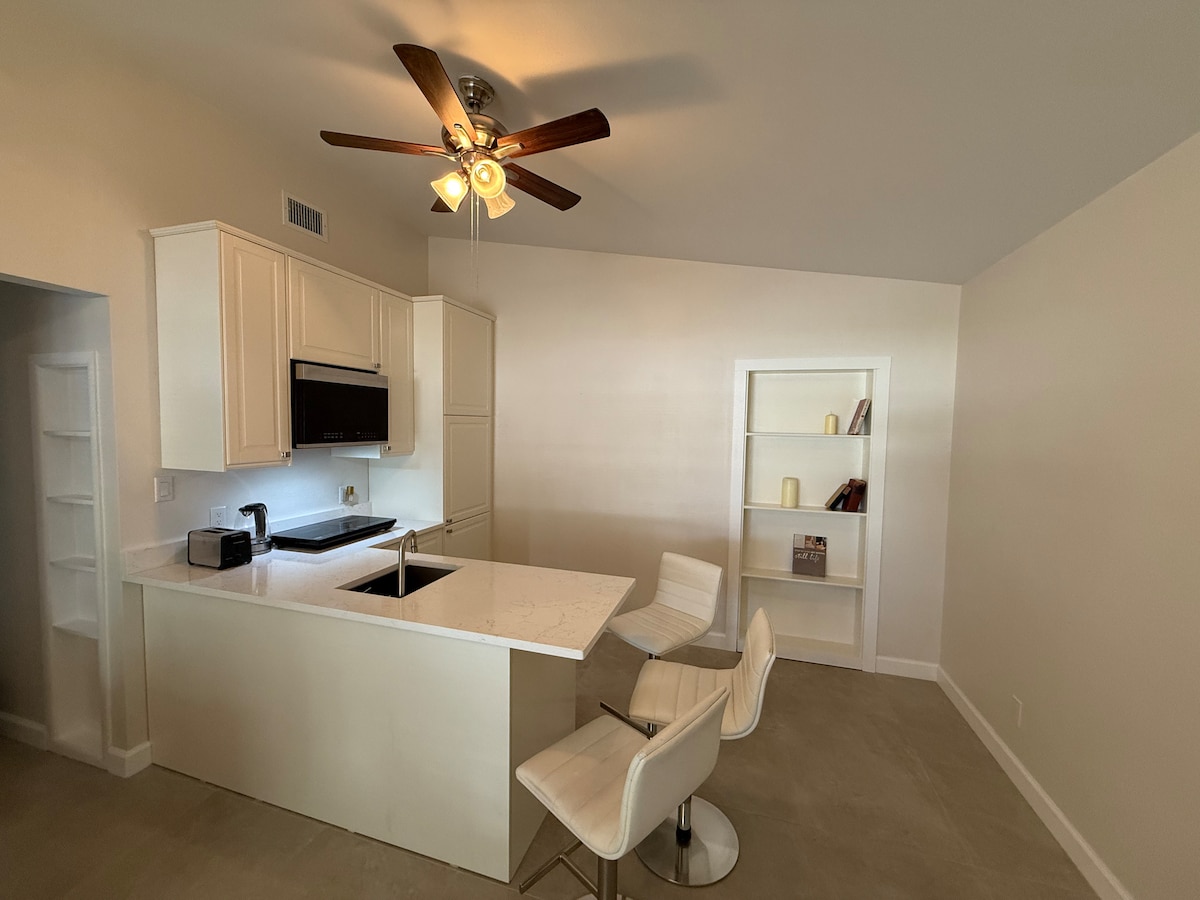 Witamy w naszym nowo wyremontowanym apartamencie z łóżkiem typu King i pełną kuchnią. Parking na podjeździe i proces samodzielnego zameldowania sprawiają, że jest to bezpieczny i wygodny pobyt, niezależnie od tego, czy podróżujesz w pojedynkę, czy jako para. Położony na cichej ulicy, ale blisko głównej drogi i dostępu do Legacy Trail + kortów do pickleballa w Pompano na końcu naszej ulicy. 5 minut do Pinecraft, lokalnych lodziarni, restauracji i około 7 mil do Siesta Key i Lido Key Beach oraz 15 minut do lotniska Sarasota.