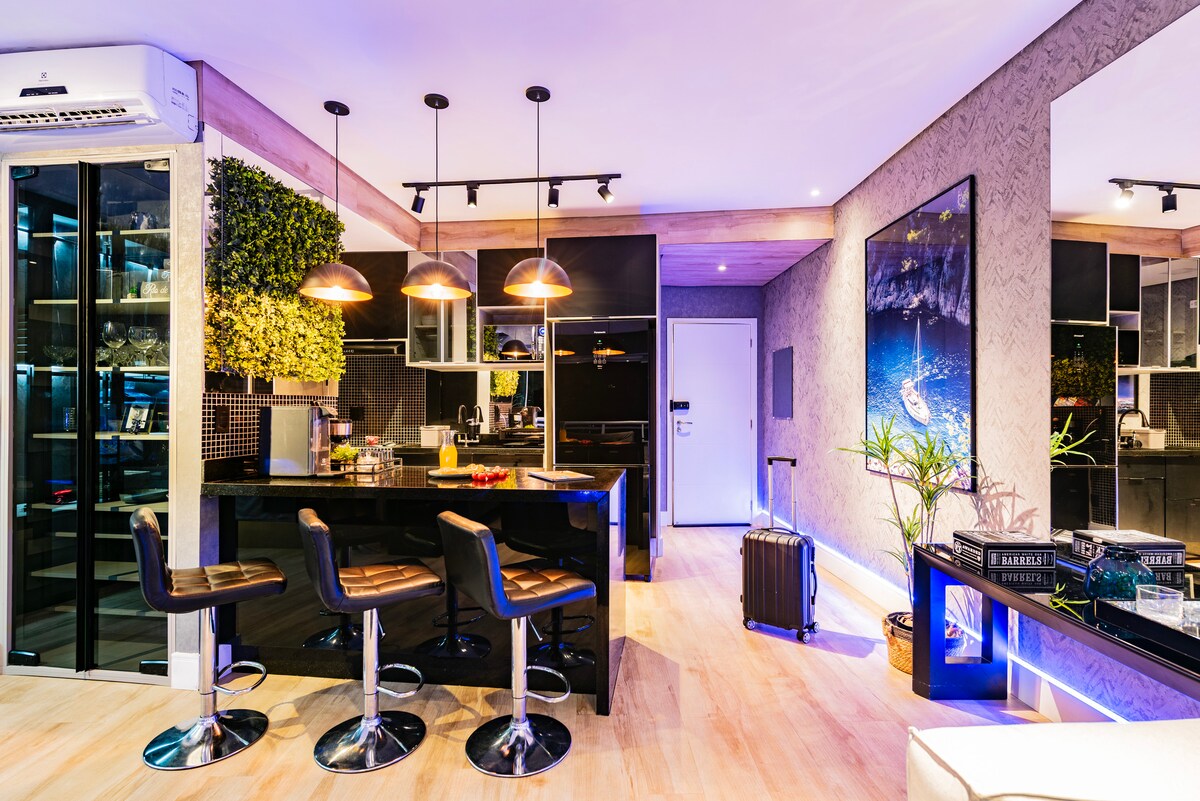 Ten apartament o powierzchni 55 m² jest idealny dla par i kadry kierowniczej w podróży służbowej. Ma wszystko, czego można oczekiwać od apartamentu: praktyczność i technologię. Osoby planujące spędzić Sylwestra w Santos mogą cieszyć się uroczystościami, nie opuszczając budynku.Z okolic basenu można podziwiać widok na morze, fajerwerki i świąteczną atmosferę miasta, bez konieczności zmagania się z ruchem ulicznym, tłumami czy męczącym dojazdem po pokazie fajerwerków.