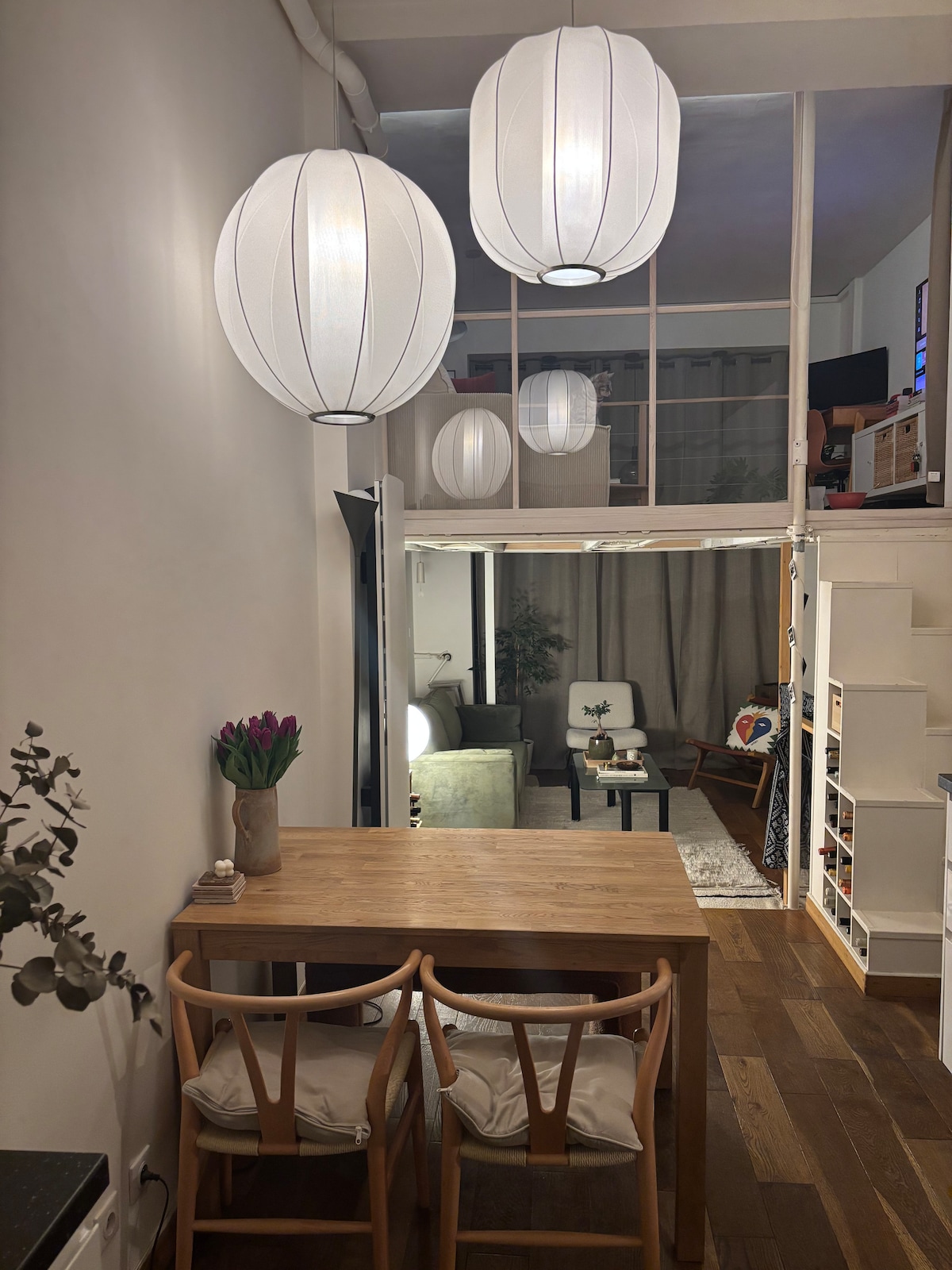 Ciesz się eleganckim i centralnie położonym mieszkaniem, w pobliżu Place de la Bastille i jego targu, Place des Vosges i Marais. To jasne i stylowe mieszkanie składa się z pierwszej otwartej przestrzeni z kuchnią, salonem i jadalnią, z której przez dwoje dużych drzwi balkonowych można przejść na południowy balkon o powierzchni 8 m2. Schody prowadzą na wysoką antresolę o powierzchni 20 m2, na której znajduje się garderoba i sypialnia z łóżkiem o szerokości 160 cm. Biała łazienka wyposażona jest w prysznic, toaletę i suszarkę do ręczników.