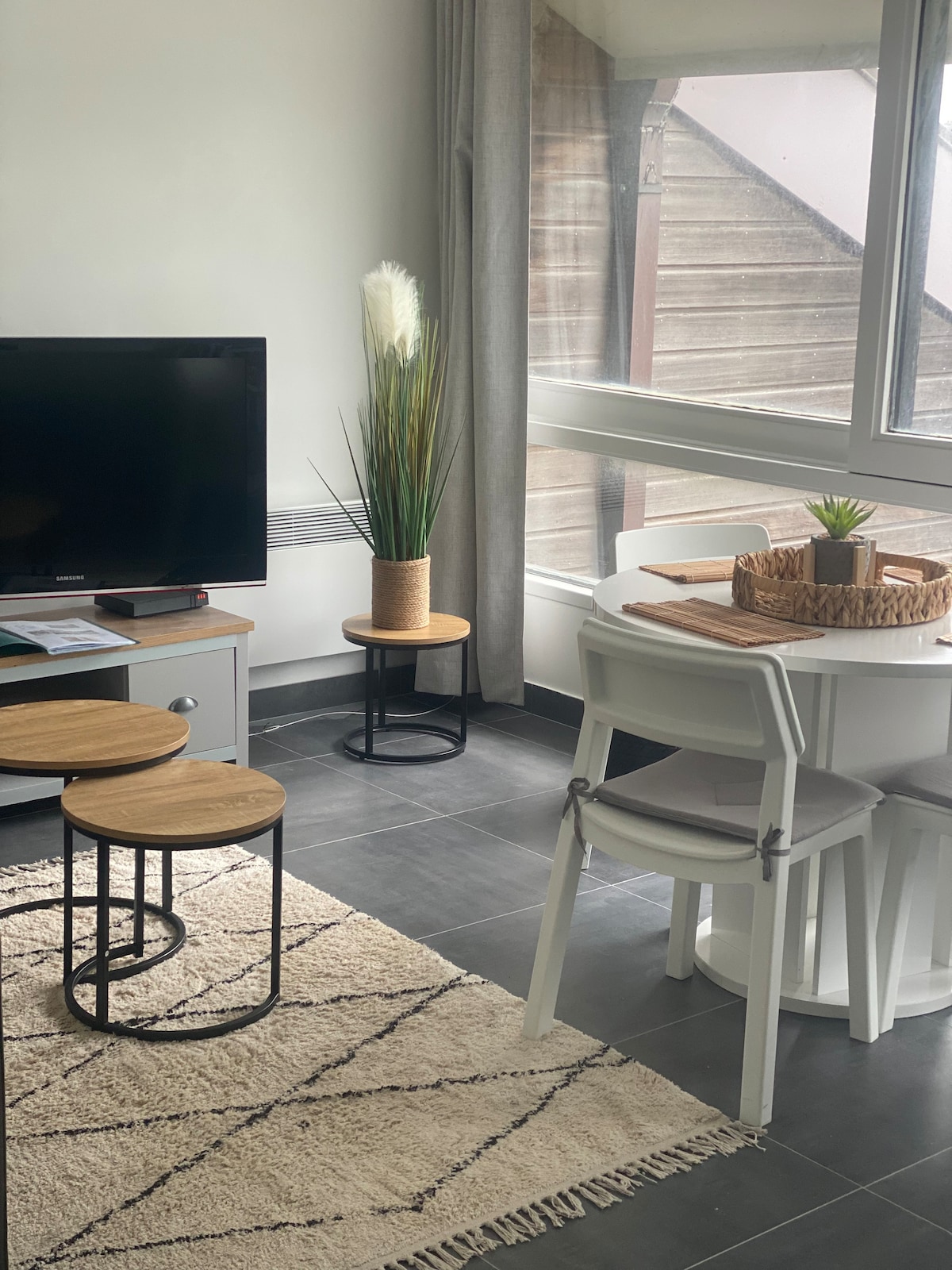 2-pokojowy apartament 50 m2 z tarasem 30 m2. 1 zadaszone miejsce parkingowe Idealnie usytuowany 7 minut spacerem od plaży i 15 minut spacerem od centrum Deauville. Supermarket, apteka, piekarnia dostępne w pobliżu apartamentu (5 do 10 minut spacerem). 5 minut spacerem od centrum kultury Franciscaines de Deauville (liczne wystawy przez cały rok, biblioteka...)