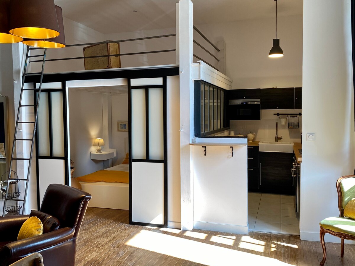 W otoczeniu zieleni i spokoju pięknego XV-wiecznego zamku położonego przy wejściu do naszego pięknego średniowiecznego miasta Dinan, będziesz mieszkać w lofcie o powierzchni 54 m2 na parterze głównego budynku. Odkryjesz jego wspaniały monumentalny kominek i zakochasz się w tym autentycznym budynku, pełnym historii i wyposażonym we wszystkie nowoczesne udogodnienia, położonym w samym sercu pięknego 3-hektarowego parku ze stawem, zaledwie 15 minut spacerem od historycznego centrum miasta lub 3 minuty jazdy bezpłatnym autobusem.