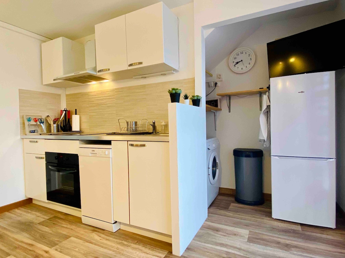 Mieszkanie jest dobrze wyposażone studio o powierzchni 25 m2, idealnie położone w centrum miasta. Na drugim i najwyższym piętrze bez windy. Ładny widok na dachy i dzwonnicę kościoła. U podnóża budynku znajduje się mały plac z wieloma udogodnieniami: ekologiczny sklep spożywczy, sklep z serami, piekarz, fryzjer, kosmetyczka, pralnia chemiczna itp. Kilka bezpłatnych parkingów w pobliżu. Z przyjemnością przywitamy Cię na krótki lub długi czas, w pracy lub na wakacje!