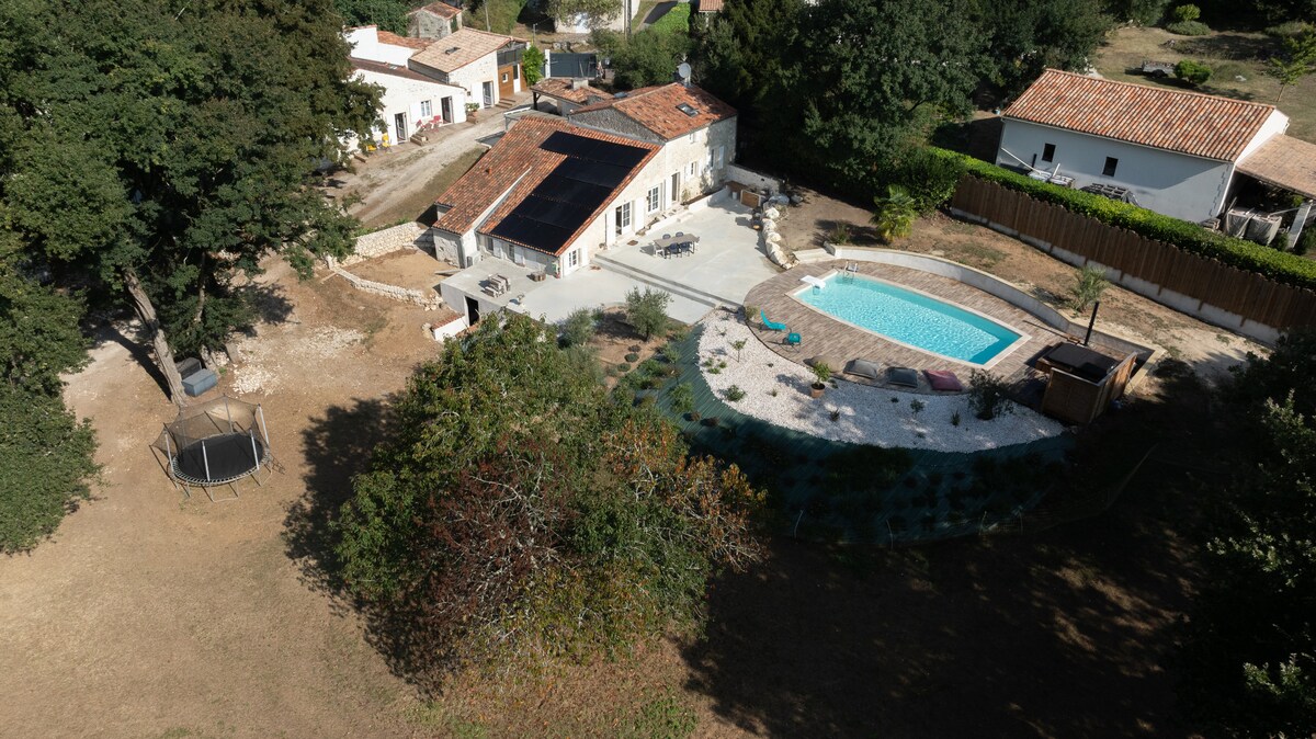 W samym sercu trójkąta Royan-Saintes-Rochefort znajdziesz spokojną oazę na wsi, zaledwie 25 km od plaż. Ten przestronny domek o powierzchni 110 m² znajduje się na 2-hektarowej posiadłości winiarskiej z XIX wieku. Ciesz się prywatnym tarasem i ogrodzonym ogrodem. Od połowy kwietnia do początku października możesz zanurzyć się w basenie ze słoną wodą o temperaturze 27°C, który dzielisz tylko z dwoma innymi gośćmi. Prawdziwy raj dla miłośników przyrody i spokoju.