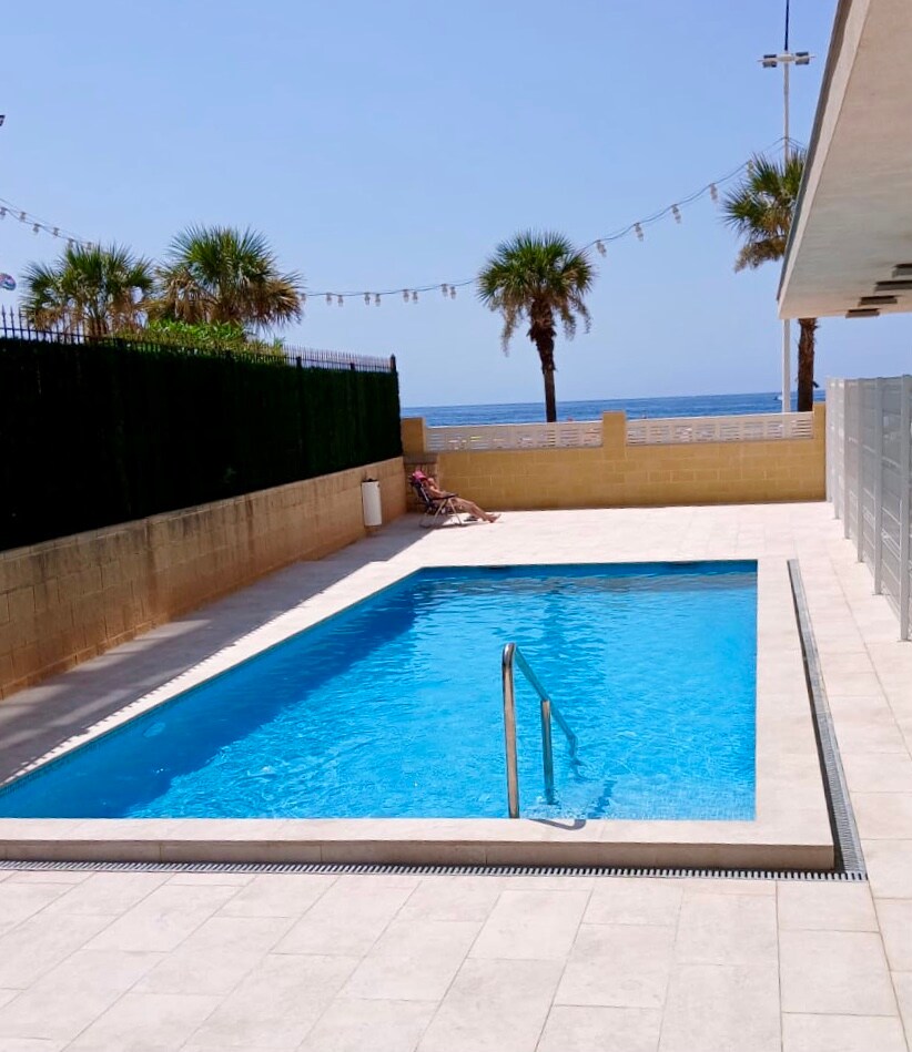 Apartament z 2 pokojami dla 4 osób w pierwszej linii plaży Poniente, z widokiem na plażę i morze, duży taras z widokiem, wszystkie pomieszczenia zewnętrzne, przestronny salon z widokiem na morze, prywatny parking, Wi-Fi, telewizor, klimatyzacja, w pełni wyposażona kuchnia (zmywarka, pralka, piekarnik), łazienka, osiedle z basenem, piękny ogród z widokiem na morze i kort tenisowy. Osiedle ma bezpośredni dostęp do promenady i jest jednym z najpiękniejszych na plaży Poniente.
