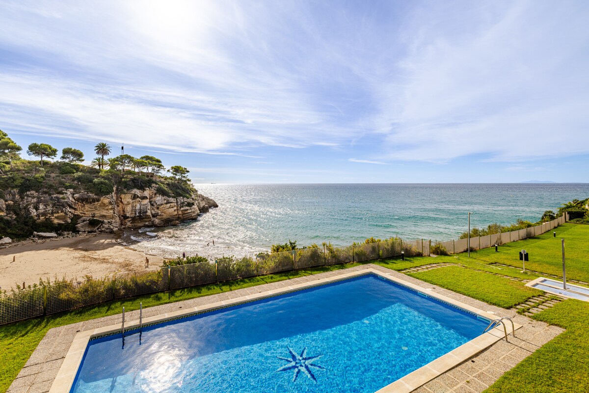Beachfront apartment with direct access to one of the best coves on the Costa Dorada, swimming pool and covered parking. 2 bedrooms, 1 bathroom, independent kitchen, living room, terrace, elevator, wifi, satellite TV, Netflix, air conditioning. 10' from Port Aventura, Ferrari Land, 5' from Aquopolis, airports: 1h Barcelona/20' Reus. Idyllic place to spend your family vacation. July and August: arrivals and departures on Saturday