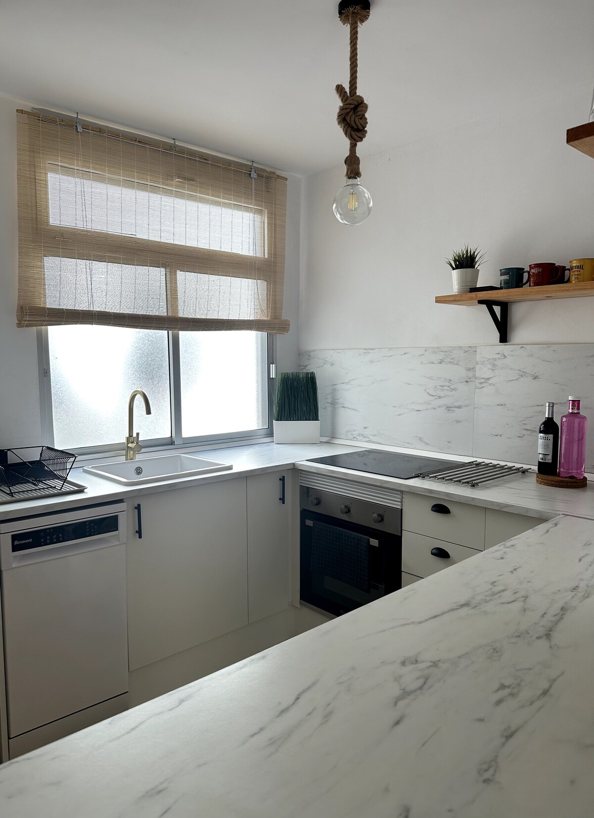 Es un apartamento con aire marinero, las estancias son frescas y agradables, el salón y cocina conforman un solo espacio y también se accede a un baño con zona de lavado y plancha, todo ello conforma la zona de día. Las habitaciones con ventanas al exterior de la terraza disponen de persianas y armarios empotrados. En un espacio que no da al exterior hemos colocado algunos aparatos de gimnasia. La terraza es amplia con zona para tender y un conjunto de sillones. Dispone de cuna y trona.
