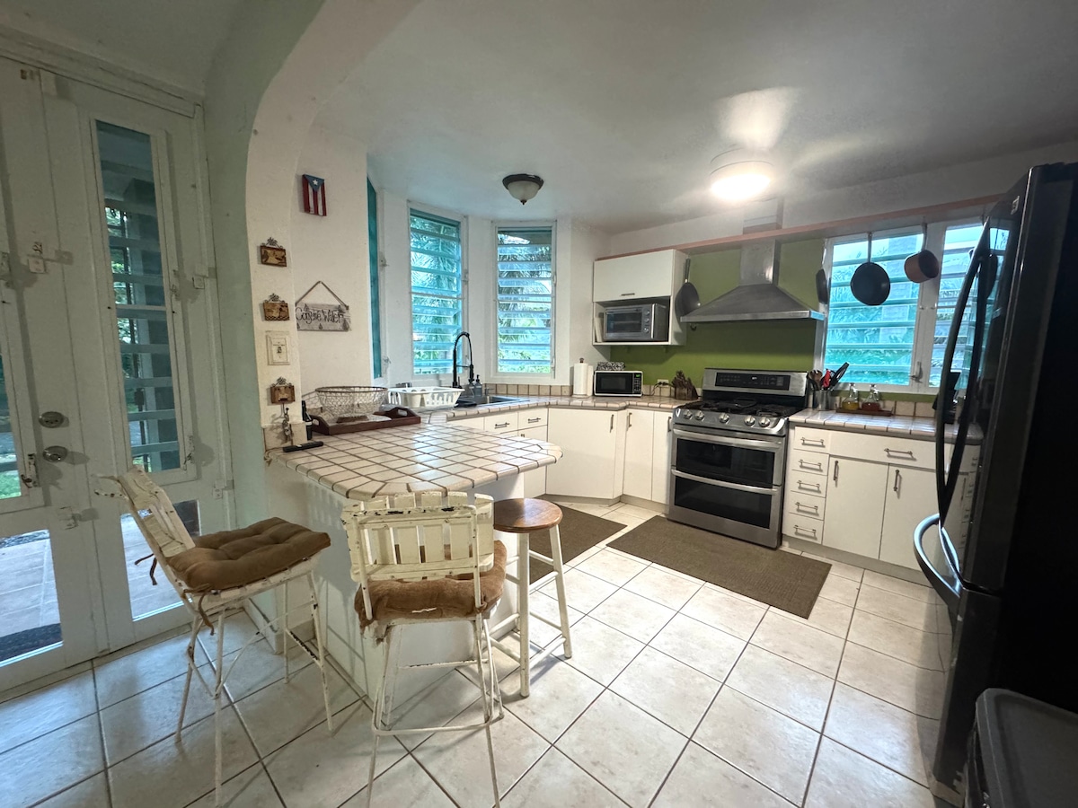 Zrelaksuj się ze swoją ulubioną osobą w tym spokojnym miejscu. Położony w odległości 11 minut spacerem (3 minuty jazdy) od Playa Fortuna, prywatnej plaży, i tuż przy ulicy ze słynnymi Luquillo Kioskos, pasem restauracji, sklepów i barów. Ciesz się pięknym widokiem na ocean i bujną zielenią! Jesteśmy w pełni zasilani energią słoneczną, chroniąc Cię przed powszechnymi przerwami w dostawie prądu. Położona między lasem deszczowym El Yunque a rozległą, piękną linią brzegową, ta lokalizacja jest nie do pobicia.