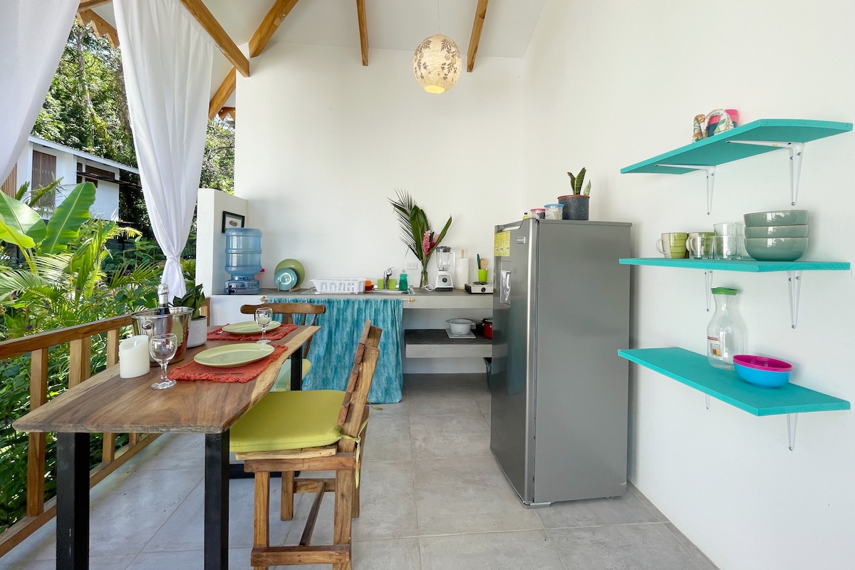 Piękny 2-osobowy bungalow ekologiczny z tarasem, hamakiem, Wi-Fi, klimatyzacją, ciepłą wodą i w pełni wyposażoną kuchnią w małej nieruchomości z basenem w bujnym tropikalnym ogrodzie. *5 minut spacerem od plaży Playa Chiquita i 12 minut jazdy od centrum Puerto Viejo. *Zacieniony parking plus dwa porty ładowania pojazdów elektrycznych na terenie nieruchomości (220 i 110 V)! *W pełni dostępny bungalow z rampą, szerszymi drzwiami i szerszą łazienką.