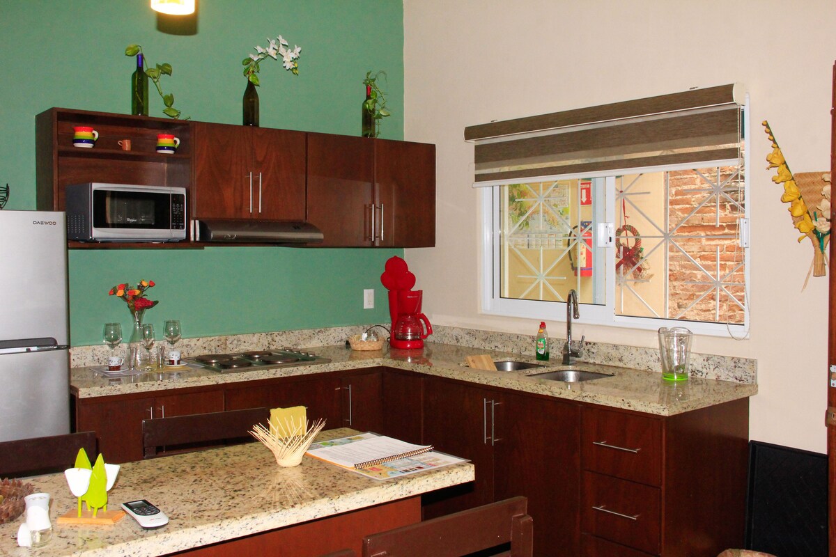 Amazing views of ocean and mountains Stroll to the beach, Malecon, plaza, and market Shared rooftop deck and dipping pool Air Conditioned Fast WIFI Modern Kitchen Triple Filtered water throughout is safe to drink Shared Bicycles Guests have described our place as quaint and homey. Our desired guests are mature adults or families. If you plan a wild Spring Break style stay, please rent somewhere else. We cannot provide housekeeping but the shared washer/dryer is free. Thanks!