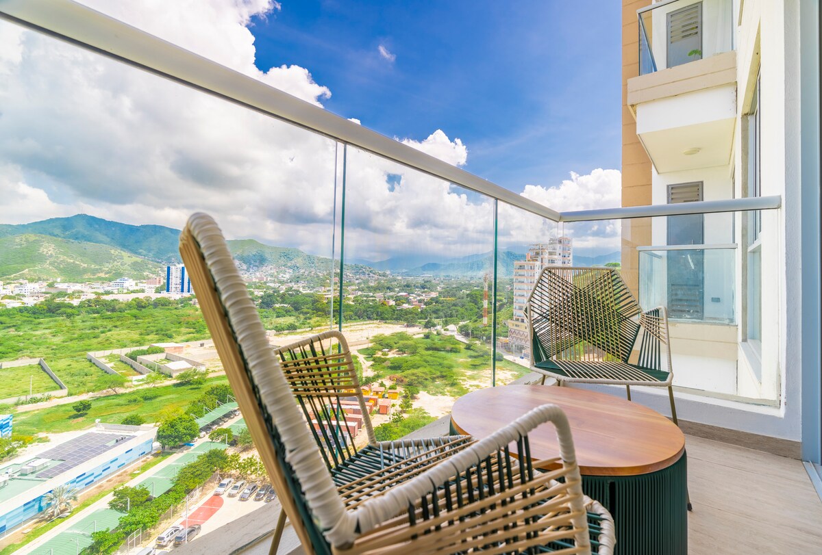 *W pełni umeblowany nowoczesny apartament* w Santa Marta, zaledwie kilka kroków od plaży Salguero i blisko El Rodadero, jednego z najpopularniejszych miejsc turystycznych w mieście. ✨ Najważniejsze: basen na dachu, jacuzzi, sauna, łaźnia turecka, pokój gier i siłownia. WIĘCEJ ⬇️. W budynku znajduje się bezpłatny parking dla gości, w zależności od dostępności. Apartament ma widok na góry. Niezależnie od tego, czy chcesz się zrelaksować, czy odkrywać, ten apartament jest idealną bazą wypadową do spędzenia czasu w Santa Marta.