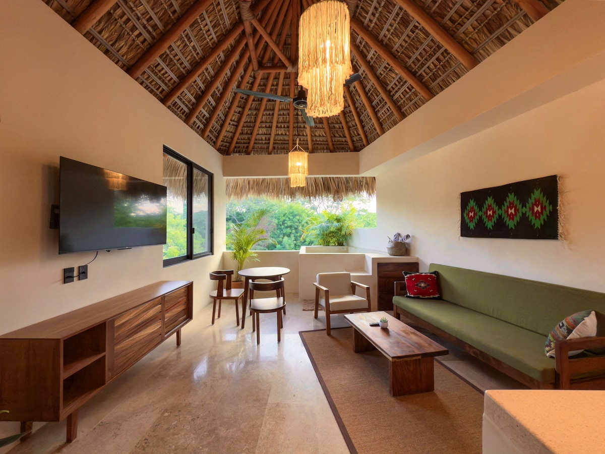 Zrelaksuj się w tym wyjątkowym i spokojnym miejscu. Ciesz się tym przytulnym apartamentem dla 2 gości, zaledwie kilka minut spacerem od plaży i głównej ulicy. Znajduje się na drugim piętrze i ma sypialnię z łóżkiem typu king, klimatyzację, telewizor i przestrzeń do pracy. Otwarta część dzienna, znajdująca się pod dachem palapa, łączy się bezpośrednio z małym basenem z częściowym widokiem na ocean. Jest też internet Starlink i w pełni wyposażona kuchnia. Idealne na relaks po dniu na plaży.