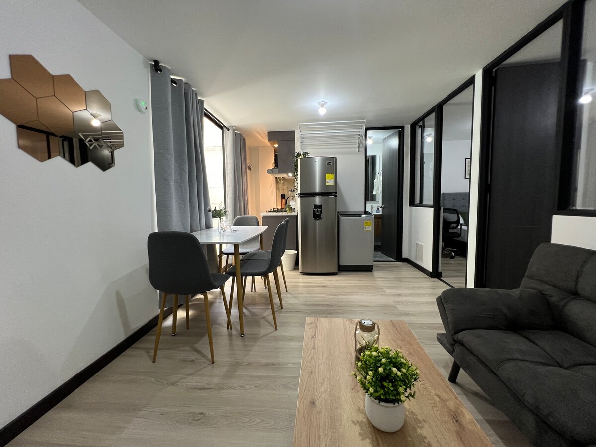 Ciesz się nowoczesnym apartamentem o powierzchni 31 metrów, położonym w spokojnym i centralnym miejscu, ponieważ znajduje się on w pobliżu głównych dróg, takich jak Calle 26, Carrera 50, Avenida La Esperanza. Położony 20 minut od lotniska El Dorado i 10 minut od terminala transportowego Bogotá.