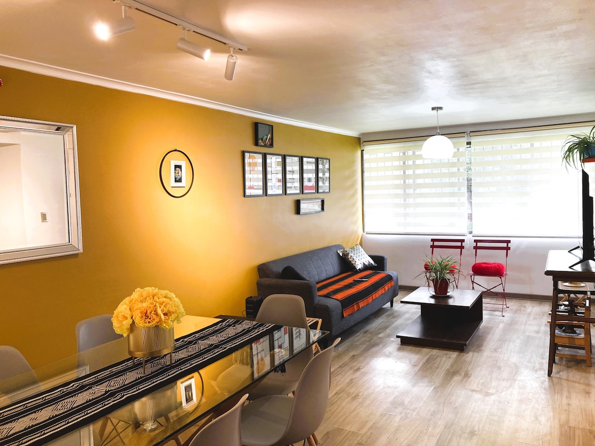 Piękny apartament w ekskluzywnej i bezpiecznej okolicy Providencia, urządzony przez artystę wizualnego. Możesz dotrzeć na piechotę do restauracji, barów, supermarketów, sklepów i stacji metra Inés de Suarez. Znajduje się na pierwszym piętrze i sąsiaduje z największym parkiem w Providencji, gdzie znajdują się tereny zielone, gry dla dzieci i maszyny do ćwiczeń. Konsjerż dostępny przez całą dobę, niezależny dostęp do apartamentu. Jadalnia dla 6 osób, 50-calowy telewizor Smart TV, wyposażona kuchnia, pralka-suszarka. Wszystko po to, by Twój pobyt był idealny!