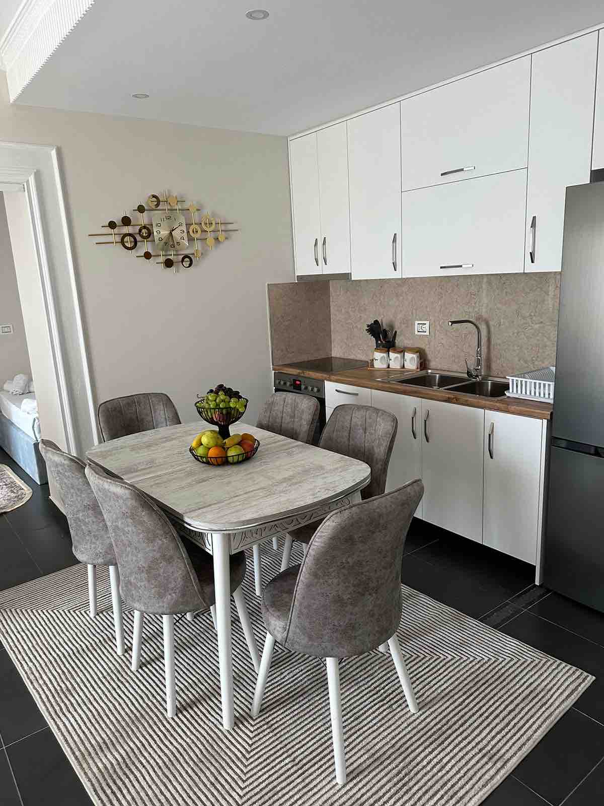 Witamy w apartamencie Mariny, przytulnym miejscu na wypoczynek przeznaczonym dla maksymalnie czterech gości, które stanowi doskonałą bazę wypadową do odkrywania Durrësu o każdej porze roku. Apartament położony jest zaledwie kilka kroków od skąpanej w słońcu plaży i tylko 1,5 km od centrum miasta. Łączy w sobie nadmorski spokój z łatwym dostępem do miejskiego życia, dzięki czemu możesz doświadczyć tego, co najlepsze z obu światów. Ta starannie zaprojektowana, ciepła i przytulna przestrzeń o powierzchni 45 m² (500 stóp kwadratowych) w układzie 1+1 daje poczucie domu bardziej niż typowy pobyt w hotelu.