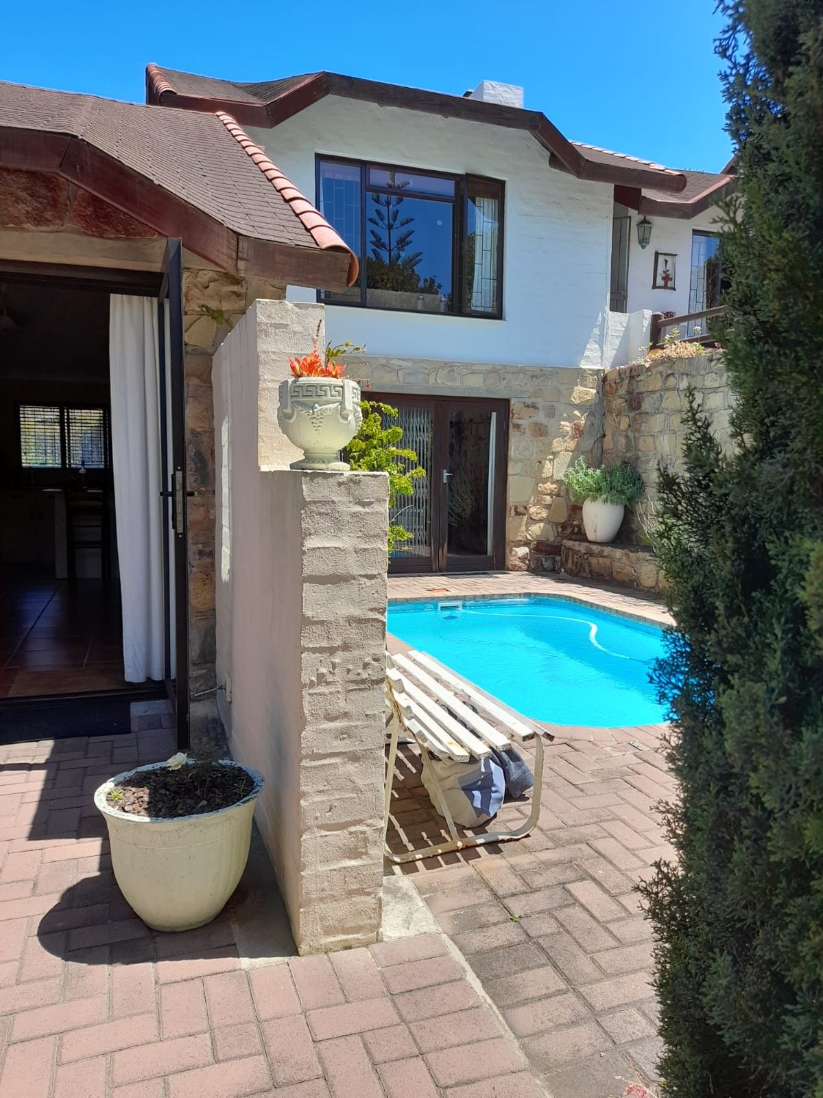 By no means on millionaires mile but located in the heart of Plettenberg Bay, with solar power, central to all amenities, beaches, shops, restaurants and bars. Obejmuje Wi-Fi, pełny telewizor DSTV itp. Na słonecznym dziedzińcu tuż obok głównego domu, wspólna przestrzeń zewnętrzna z krytym bezpiecznym parkingiem tylko dla 1 samochodu i wspólnym basenem. Nie akceptujemy rezerwacji Rage 2 sypialnie z sypialnią na poddaszu, pełna kuchnia i salon z tarasem i tarasem z widokiem na Lookout Bay i Lagunę.