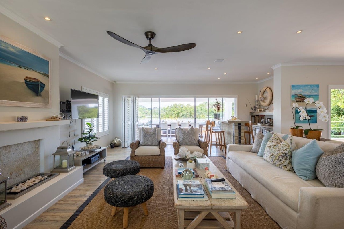 This self catering house accommodates 8. Two spacious en-suite bedrooms and 2 twin-bedded bedrooms (sharing a bathroom) on the 1st floor. The living area consists of a semi open plan dining-kitchen- and lounge area that leads onto an expansive furnished patio, sun beds and a gas barbecue. Inverter powered - immune to load shedding.A gas fireplace +electric wallpanels The walk-in garage has laundry facilities. 3Bicycles and a 2 seater canoe is available. The Jetty is to moor guest’s own boat.