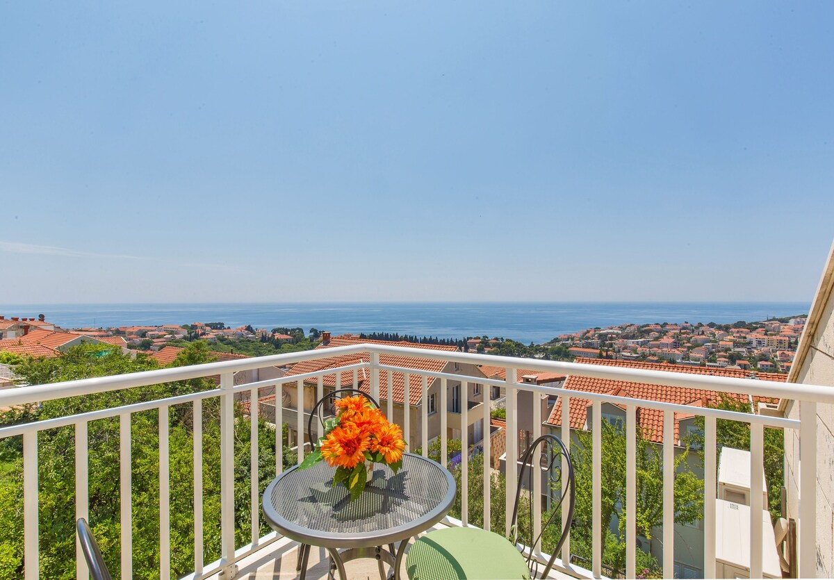 Ten uroczy pokój z umeblowanym balkonem znajduje się na poddaszu domu rodzinnego, który składa się z 5 pokoi gościnnych. Jest w nim podwójne łóżko dla dwojga i sofa. Pokój jest klimatyzowany i wyposażony w telewizor, lodówkę, czajnik i bezpłatne Wi-Fi. Na korytarzu znajduje się prywatna, dobrze wyposażona łazienka (ręczniki, żel pod prysznic, szampon). Z prywatnego balkonu można podziwiać zapierające dech w piersiach panoramiczne widoki na okolicę Dubrownika i morze.