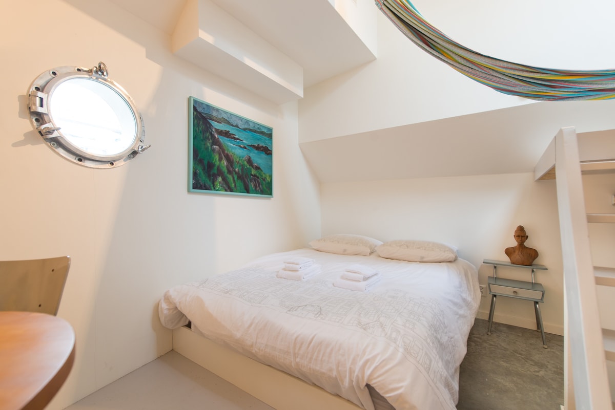 Wees welkom in de moderne bed & breakfast aan boord van woonschip Sequana. Met een ligplaats aan de oever van het IJmeer. We verwelkomen je graag in de kapiteinshut van dit mooie woonschip. De ruime privé studio (30 m2) heeft een heerlijk 2 persoons bankbed in de living, een eigen badkamer en wc en een volwaardige keuken. Je kunt gebruik maken van een waterkoker en koffiezet automaat en een koelkastje. Er is gratis koffie, thee, suiker en kruiden aanwezig. Je zult je hier gelijk thuis voelen!