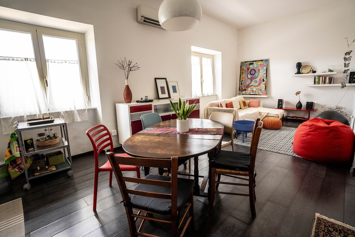 In 2023 my son Guglielmo and I decided to restore the old oratory of a church from the 1600s by creating a two floor apartment: upstairs we have 2 bedrooms equipped with AC and 2 en-suite bathrooms with shower; downstairs a spacious living room with stereo Available a table outside with great view and a nice garden 50 mt away where to have a private wine tasting or barbecue for all the guests of our 4 apartments, after 7pm if booked large in advance Large free parking area 100 mt away