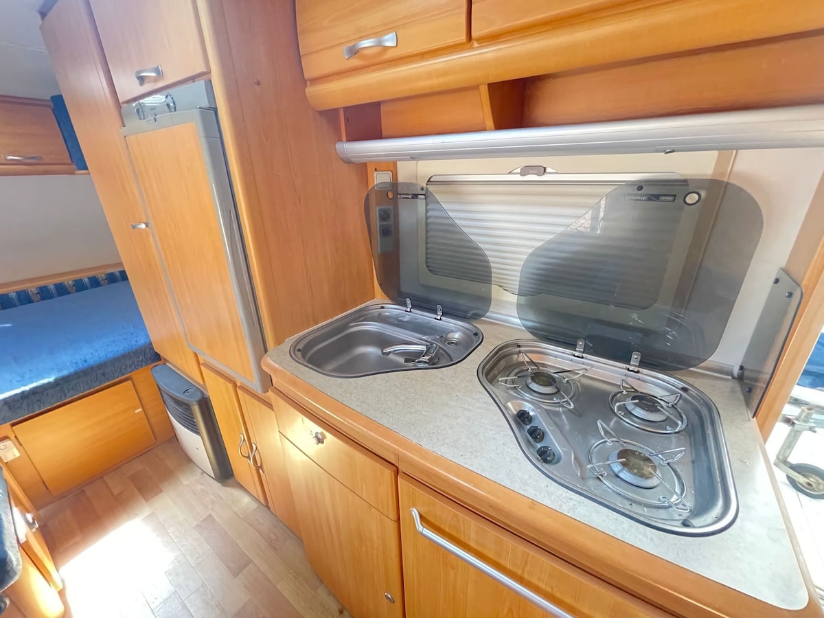 Campari pomieści 4 osobową ekipę. W skład wyposażenia przyczepy wchodzi rozkładana kanapa na łóżko dwuosobowe i dwa jednoosobowe, kanapa, lodówka, czajnik, płyta indukcyjna, dwie szafy, naczynia, przedsionek. Na terenie campingu znajduje się również - strefa spa z masażami, sauną i jacuzzi, dwa pomieszczenia sanitarne z łazienkami i prysznicami, beach bar, strefa coworkingowa, szkoła windsurfingu, plac zabaw, restauracja oraz bezpłatny parking.