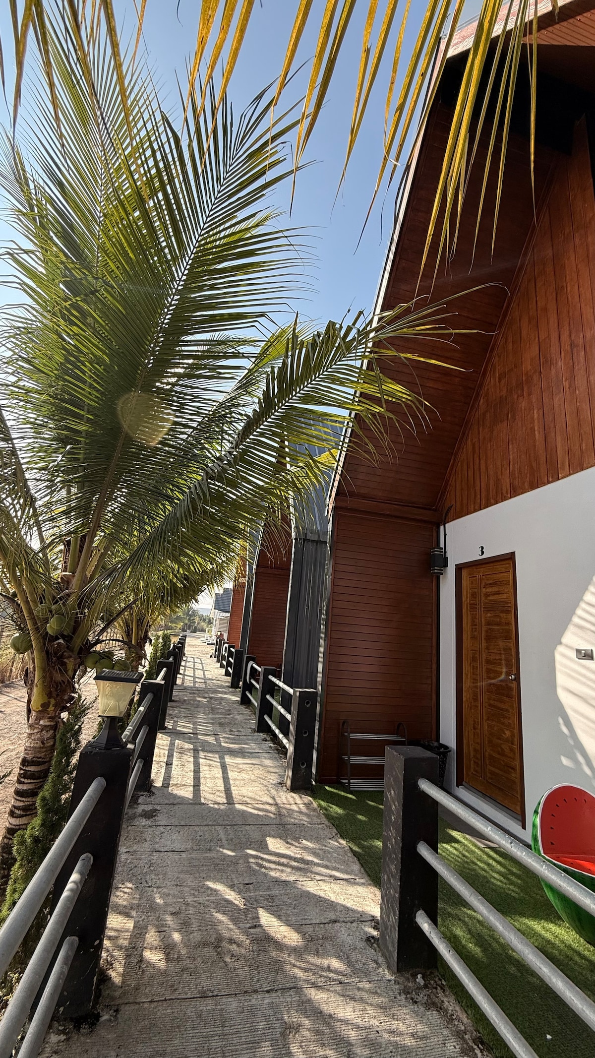 This accommodation is a typical garden house with coconut trees in front and a coconut farm nearby. The natural surroundings are beautiful, and it's close to the mountains. If you're lucky, you might even see thick fog, making for stunning photos.