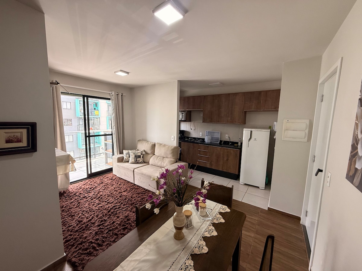Doskonały apartament w szlachetnej dzielnicy Ponta Grossa, w pobliżu rynków, aptek, restauracji, fast foodów. Wygodna i swobodna przestrzeń. Nasz salon/jadalnia ma rustykalny wygląd, gdzie niedoskonałości są postrzegane jako piękne, ponieważ opowiadają historię. Są 2 sypialnie, obie z podwójnym łóżkiem. W pełni wyposażona kuchnia/pralnia. Całodobowa ochrona, prywatny parking. Skorzystaj z okazji, aby odpocząć i poznać wodospady Mariquinha i São Jorge, Vila Velha i Buraco do Padre.