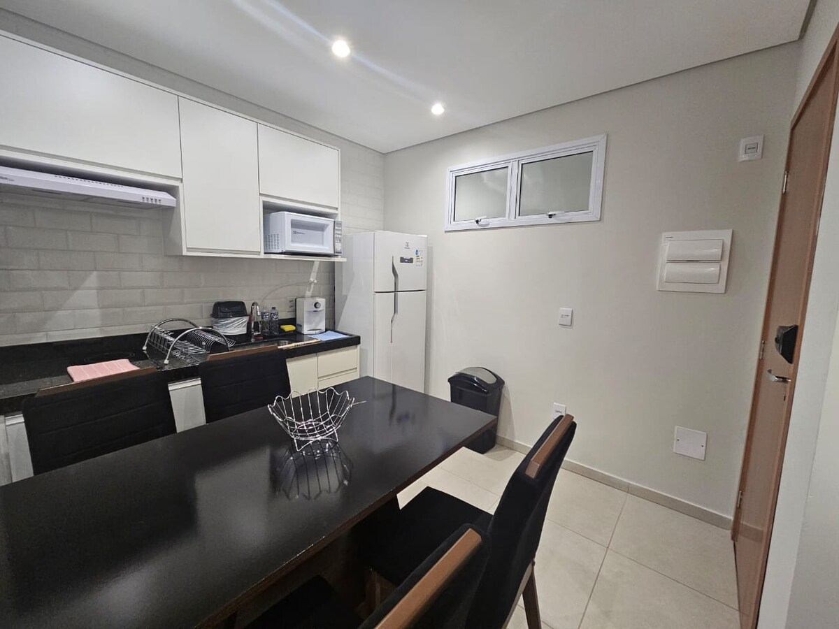 Nowo wybudowany apartament w centrum Sertãozinho. Miejsce dla maksymalnie 3 osób. Strategiczna lokalizacja w pobliżu apteki, oddziałów banków, supermarketu i stacji benzynowej. Piekarnia położona na rogu apartamentu. Klimatyzacja, wentylator sufitowy, łóżko podwójne, rozkładana sofa, kuchenka mikrofalowa, stół, kuchenka i telewizor. Dostępne do użytku pościel, kostium kąpielowy, poduszki, koc i przybory kuchenne. Miejsce parkingowe na następnej ulicy.