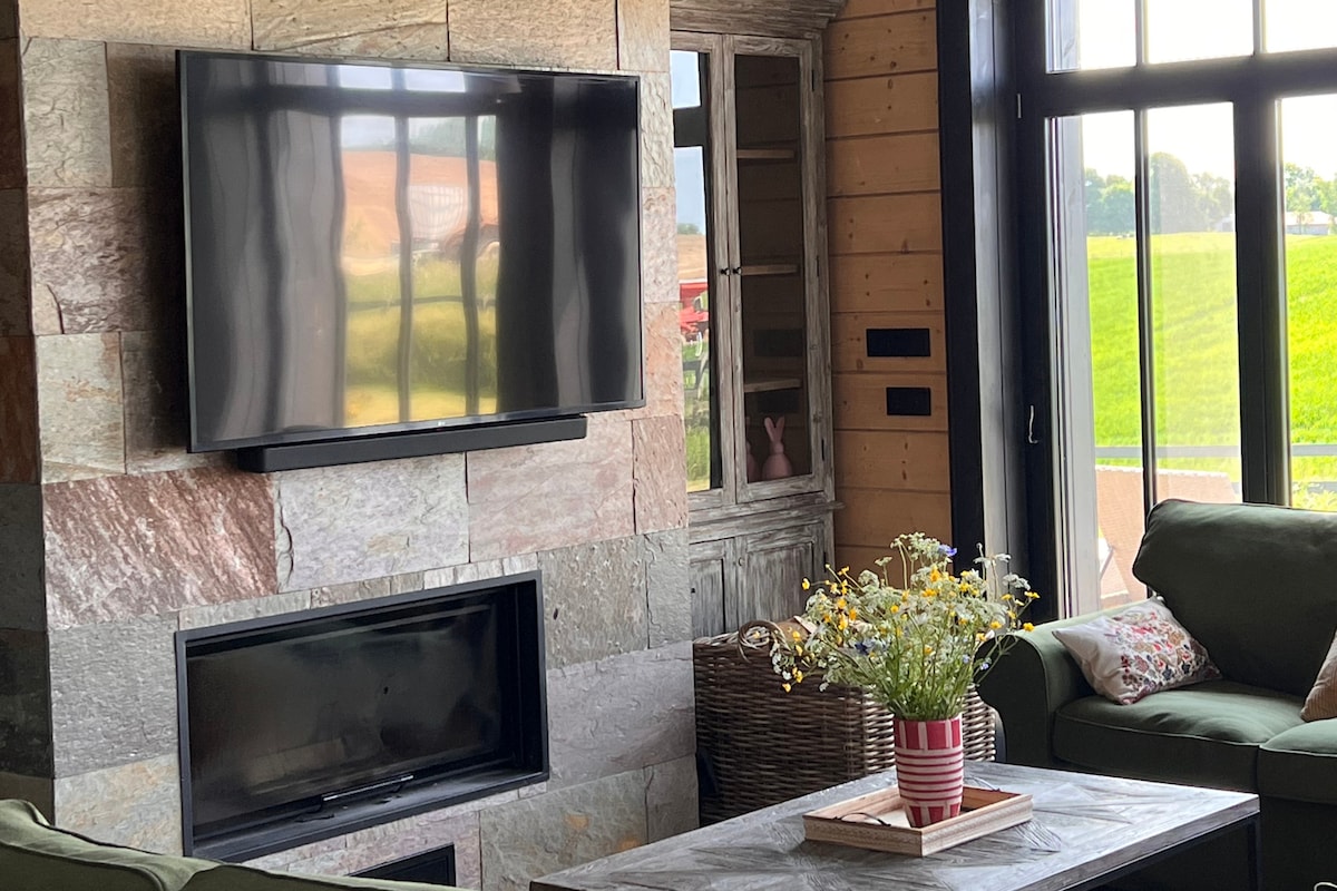 Popatrz w rozgwieżdżone niebo i zapomnij o wszystkim innym. Prezentujemy piękny apartament z widokiem na rzekę , dwie sypialnie , salon z aneksem kuchennym , jadalnia oraz łazienka , kuchnia w pełni wyposażona w zmywarkę oraz piekarnik , w łazience pralka , duży taras z miejscem do grillowania , na wspólnej części do użytku wszystkich Naszych gości balia z hydromasażem , kajaki , łódka , plac zabaw dla dzieci , miejsce na ognisko oraz pomosty do wędkowania