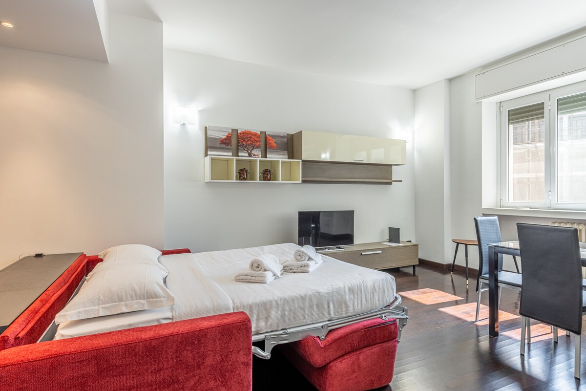 Lovely third floor studio in the heart of Milan, right next to Arco della Pace. Adjacent to the newly renovated apartment is a terrace facing Piazza dei Volontari square. Spend your day enjoying a walk in the beautiful Parco Sempione and visiting the city's landmarks (all below a 20min walk). At night this area transforms in one of the trendiest in Milan, with a great variety of restaurants and bars. Be aware that since the apartment is in a liberty building from 1924 there is no elevator.